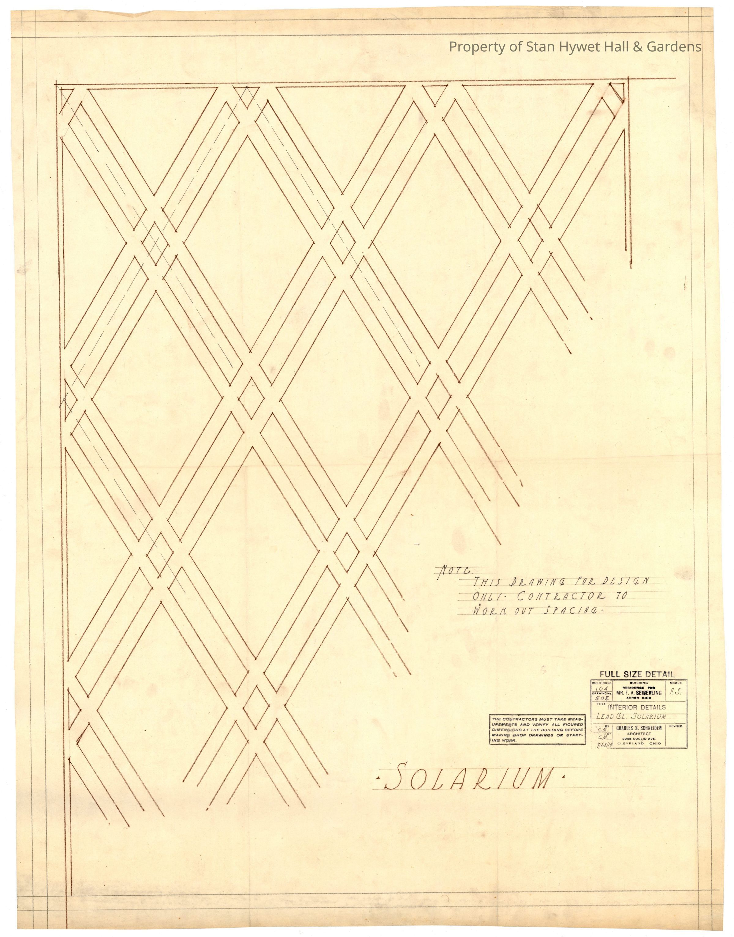 Historic Drawing: Full size detail of the double diamond pattern leaded glass windows in the Solarium. Titled "Interior Details Lead GL. Solarium".