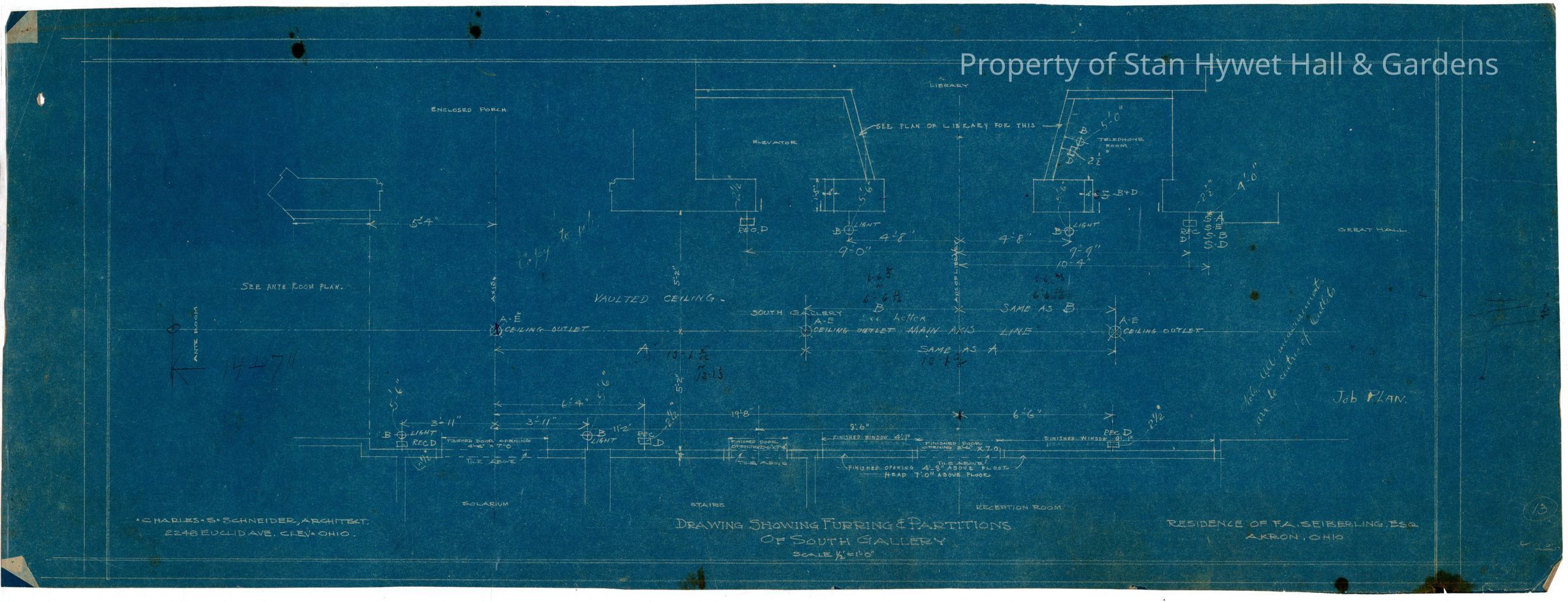 Historic blueprint: Plan for furring, partitions, and electrical for the Linenfold Hallway in Stan Hywet Hall. Titled "Drawing Showing Furring & Partitions of South Gallery".