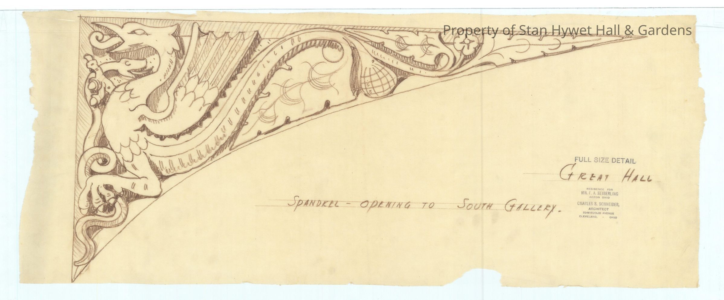 Historic Drawing: Full sized detailed drawing of the spandrel carved into arch of doorway leading from Great Hall into the Linenfold Hallway. Spandrel features a dragon fighting a snake. Titled "Spandrel-Opening to South Gallery".