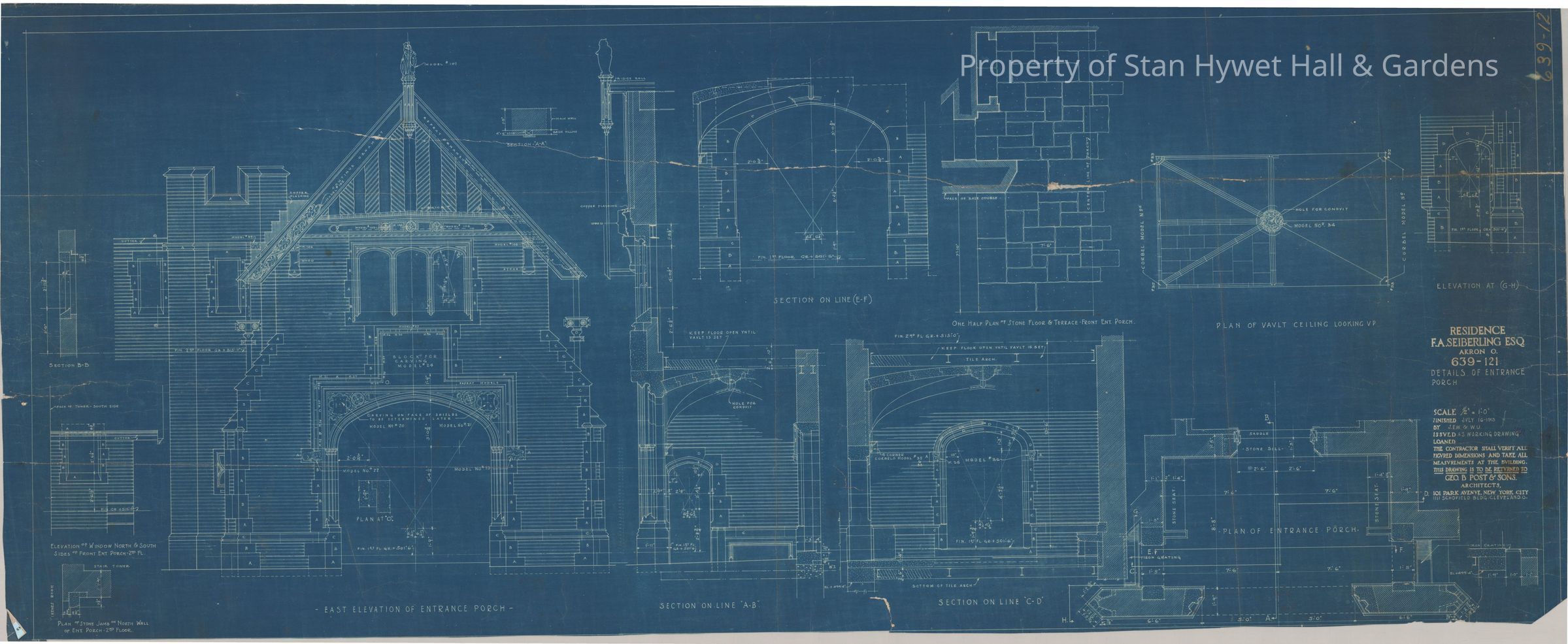Historic blueprint: Detailed drawings of elements of the Entrance Porch, including several elevations and plans. Titled "Details of Entrance Porch".
