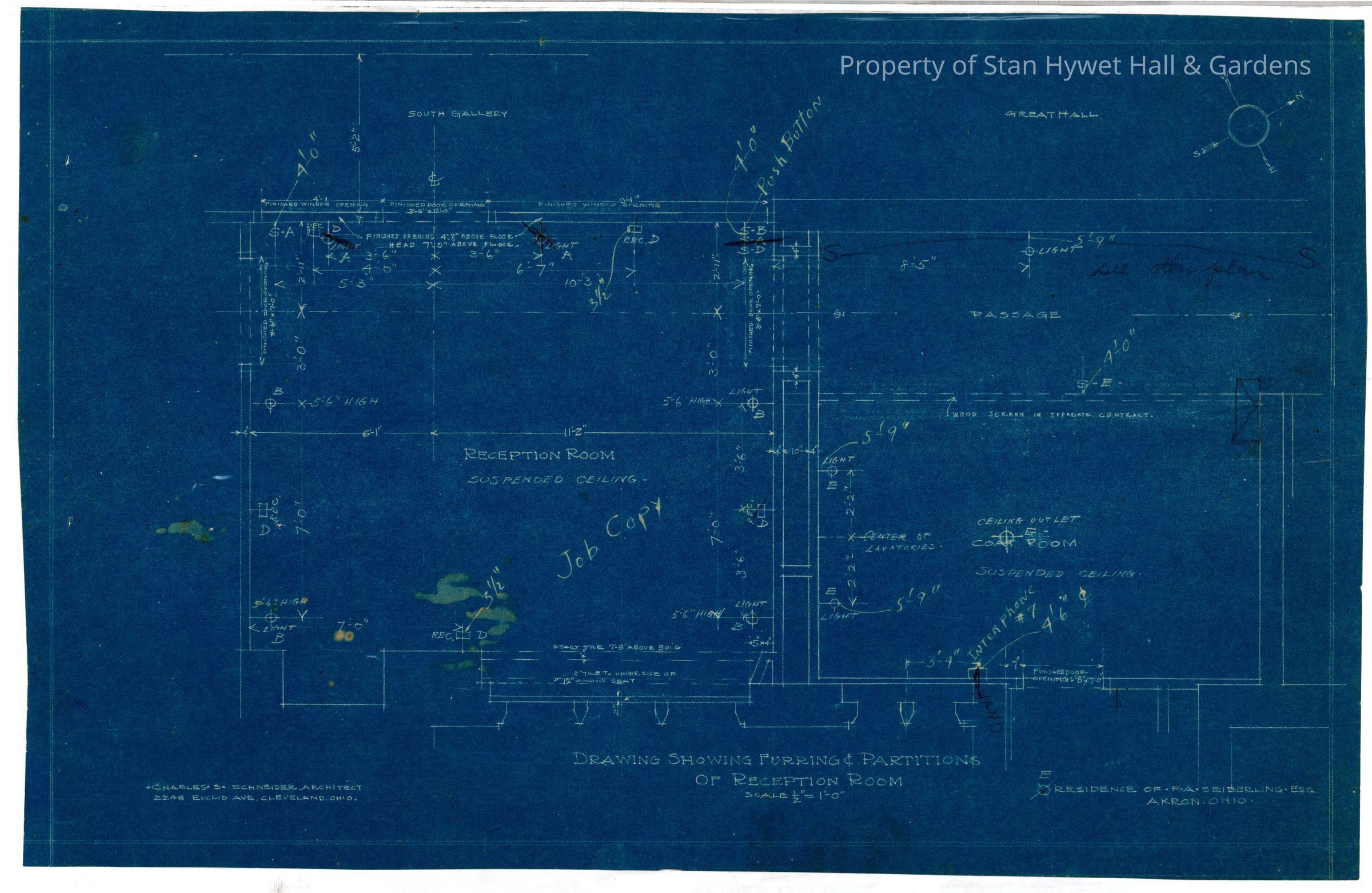 Historic blueprint: Plan for furring, partitions, and electrical for the Reception Room in Stan Hywet Hall. Also includes the Powder Room and hallway.