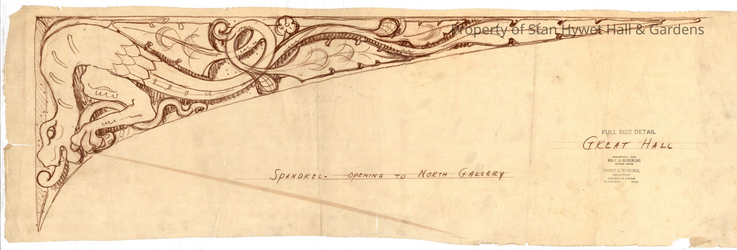 Historic Drawing: Full sized detail of the spandrel over the doorway between the Great Hall and the North Hallway in Stan Hywet Hall. Titled "Spandrel-Opening to North Gallery".
