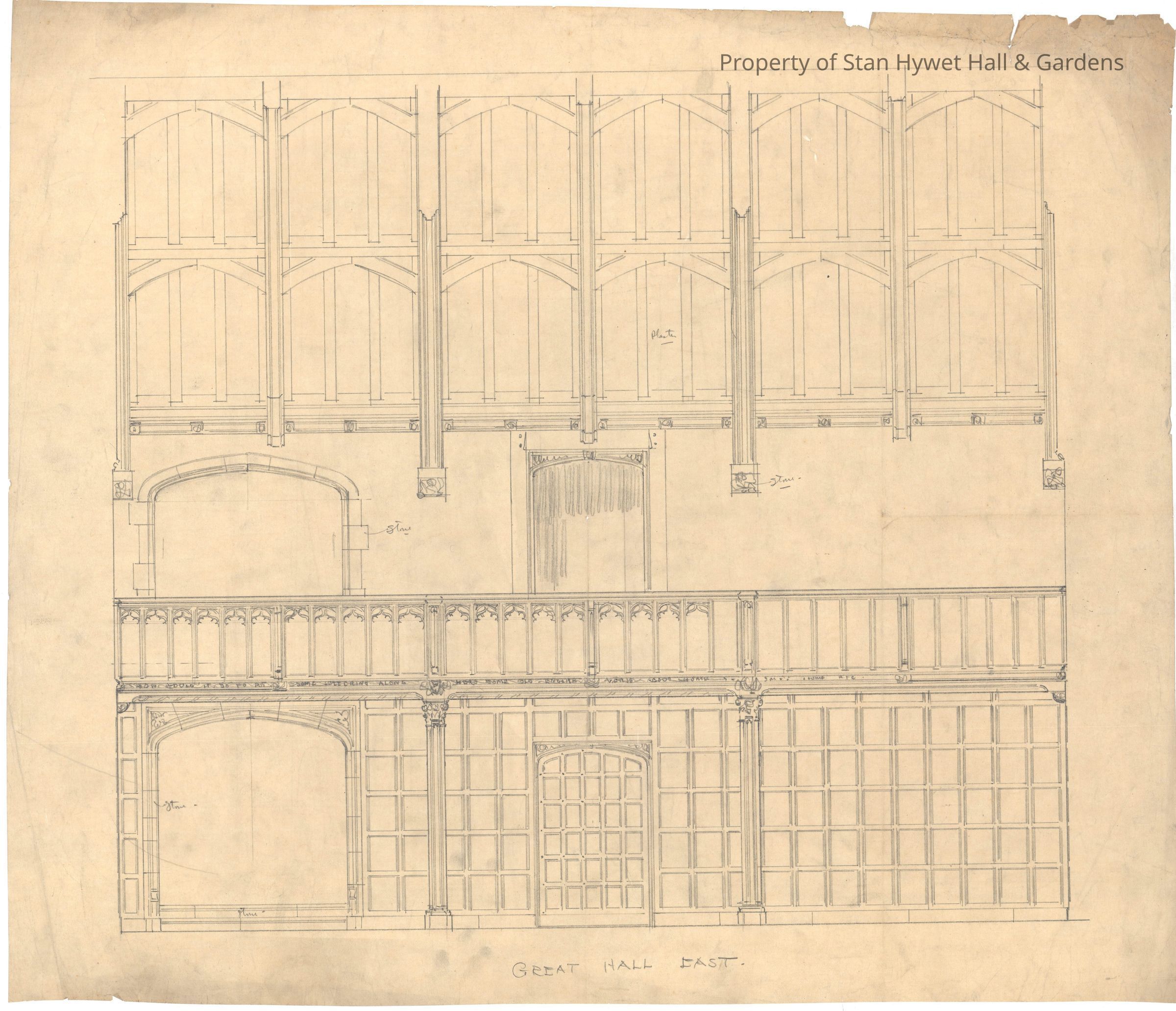 Historic drawing: Detailed drawing of the Great Hall's east wall with the full balcony drawn. Titled "Great Hall East".Collection