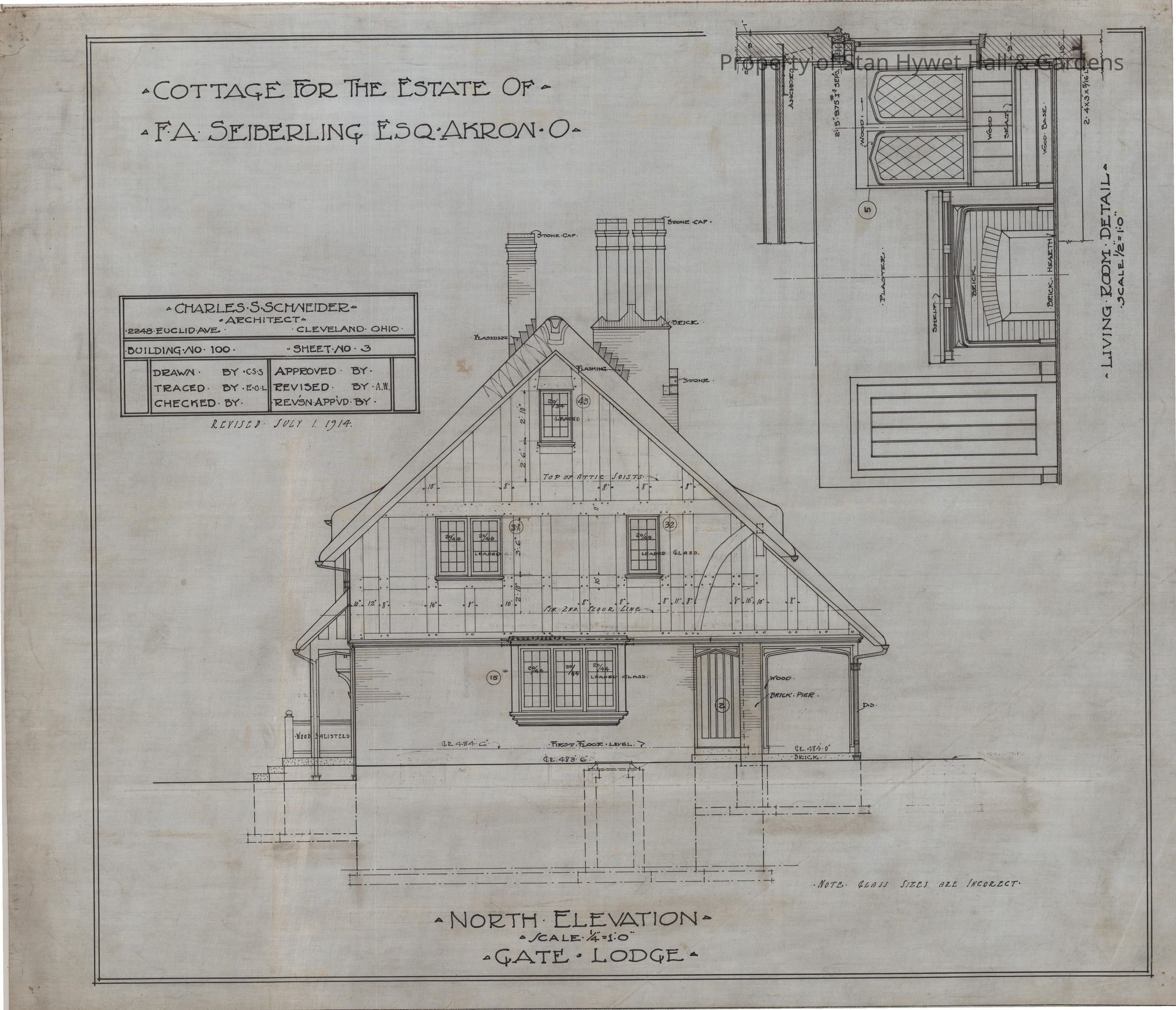 Historic Drawing: North elevation of Gate Lodge and detail of living room. Titled "Cottage for the estate of F.A. Seiberling, ESQ, Akron O".