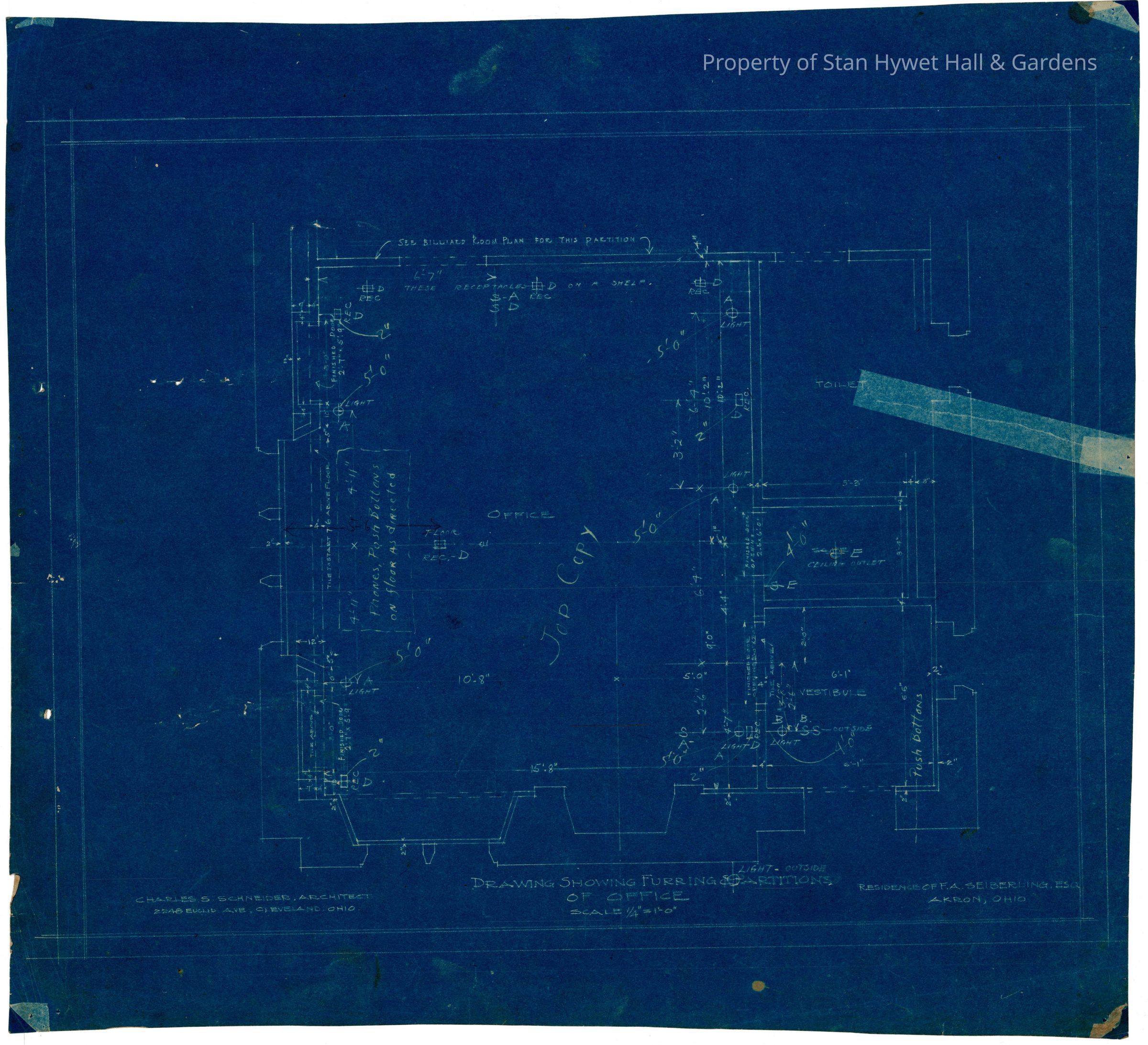 Historic blueprint: Plan for furring, partitions, and electrical for FAS Office in Stan Hywet Hall. Titled "Drawing Showing Furring & Partitions of Office".