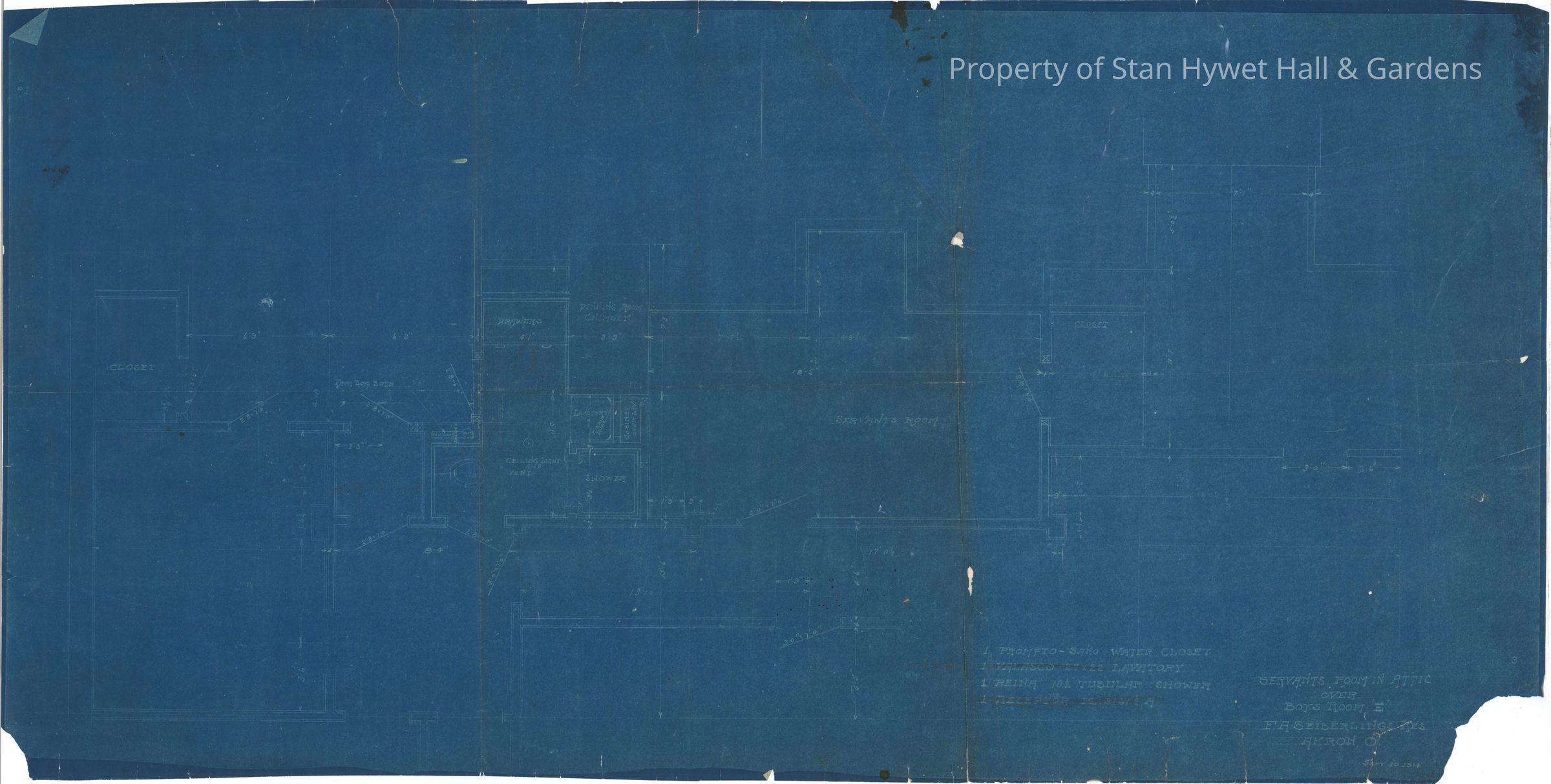 Historic blueprint: Incomplete plan of Male Domestic Quarters & Silhouette Guest Room on third floor of Stan Hywet Hall. Titled "Servant's Room in attic over Boys Room E".Collection