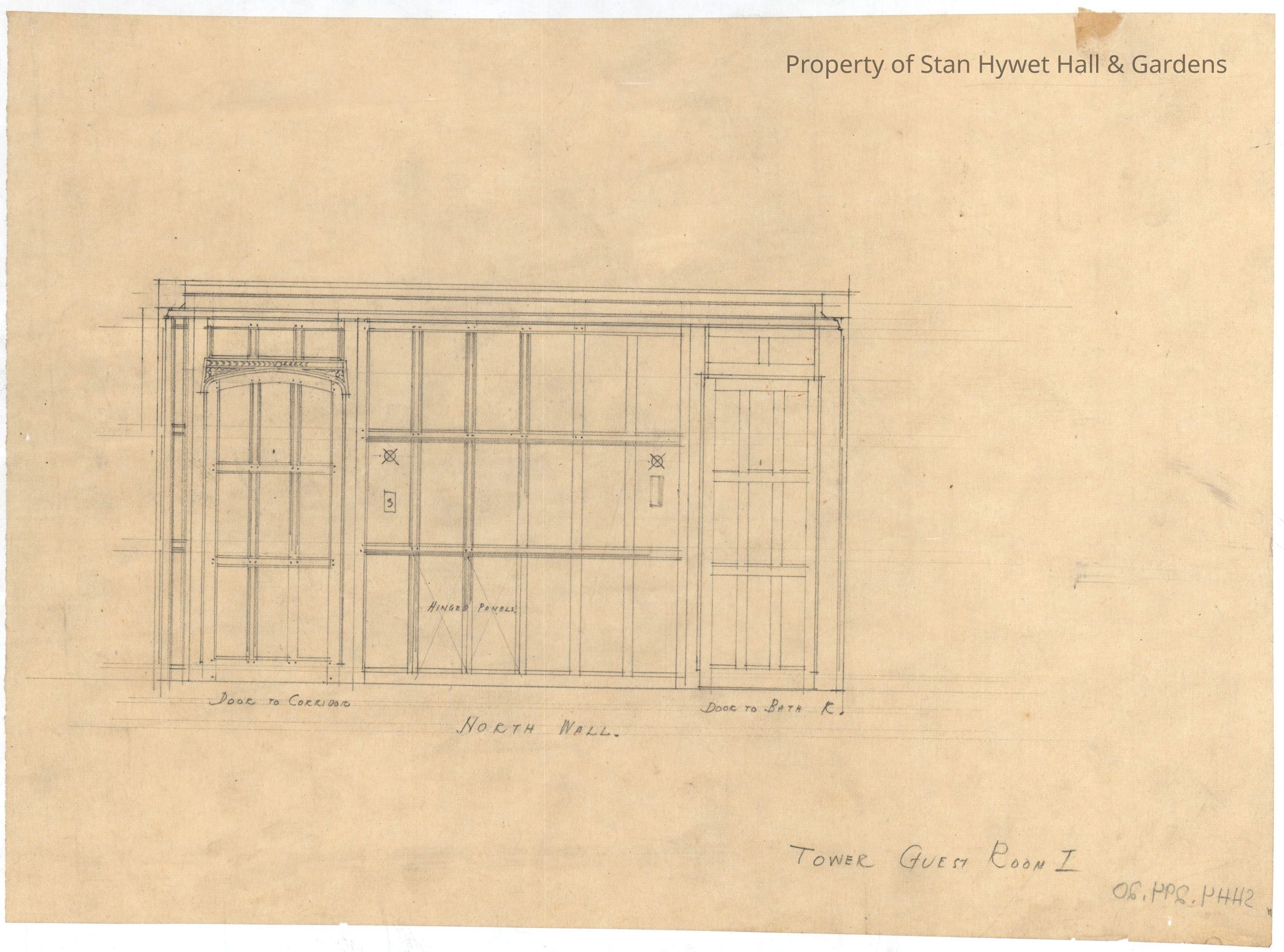 Historic drawing: Detailed drawing of the Cromwell Guest Bedroom's north wall. Titled "North Wall Tower Guest Room I".Collection