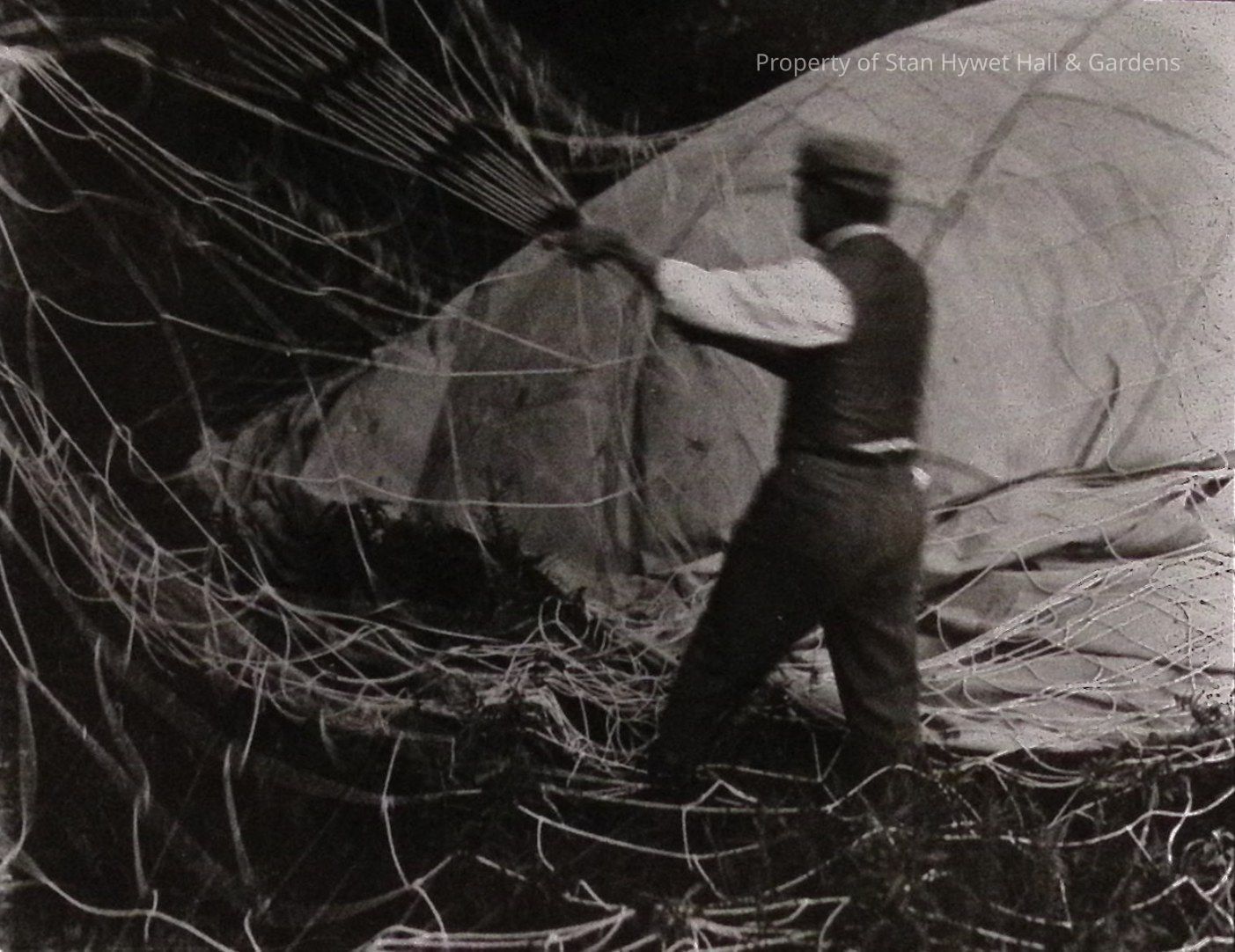 Print developed from gelatin dry plate glass negative, a man in shirt sleeves, suit trousers and vest and wearing straw hat, pulling on the lines of a balloon, with partially inflated balloon visible at right behind him, stands amidst the lines and pulls lines from left side of image. Action photos so slightly out of focus.