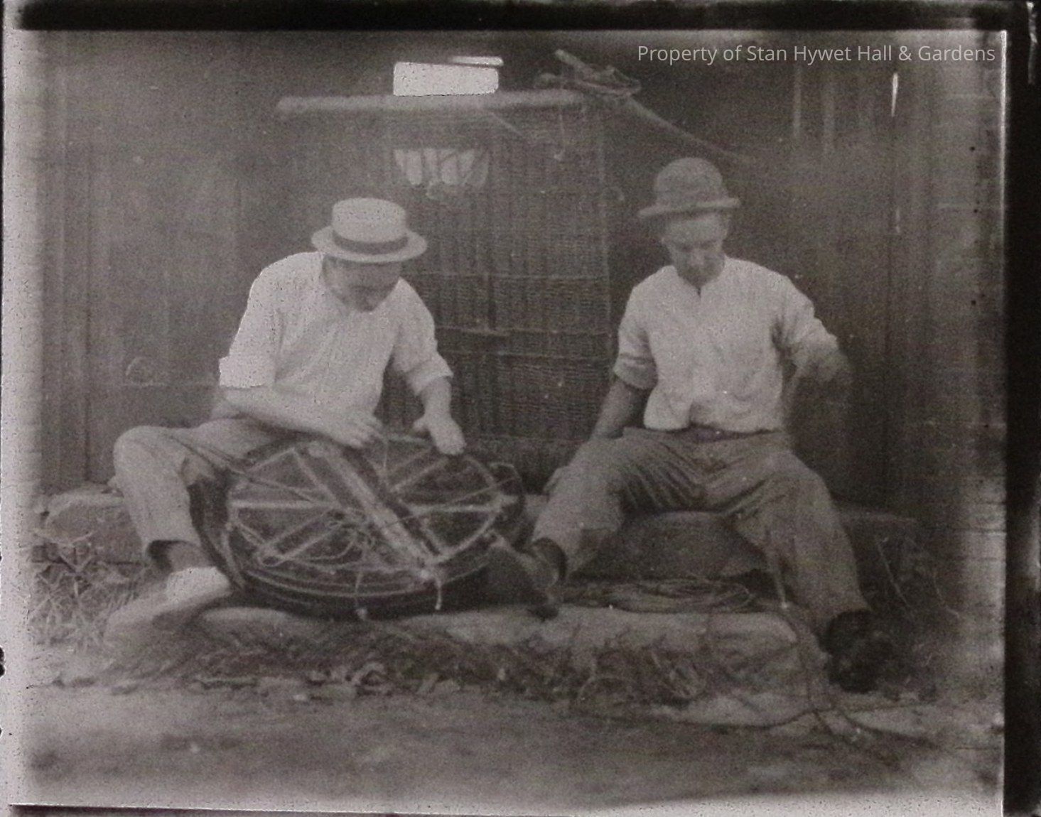 Print developed from gelatin dry plate glass negative. Two men seated on stone steps of a brick building, wearing shirt sleeves, trousers and hats, man at right holding balloon lines, man at left possibly threading lines through large disc which may be the top vent of the balloon, passenger basket visible behind them.