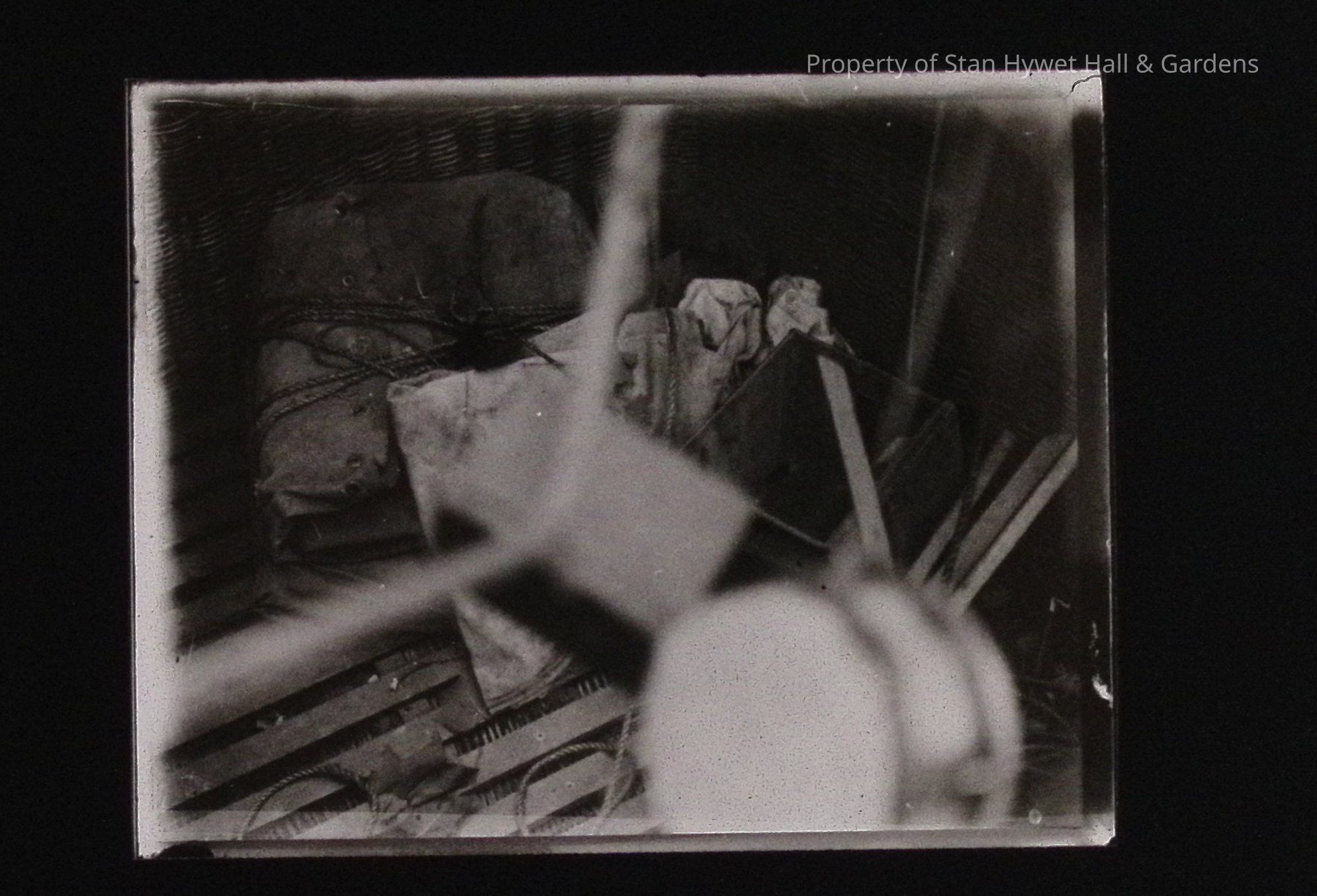 Print developed from gelatin dry plate glass negative. Inside of passenger basket for balloon, rope lines, wooden boards, wooden box, wrapped tarp, fabric and leaves visible on bottom of basket, line and instrument in foreground, both out of focus.