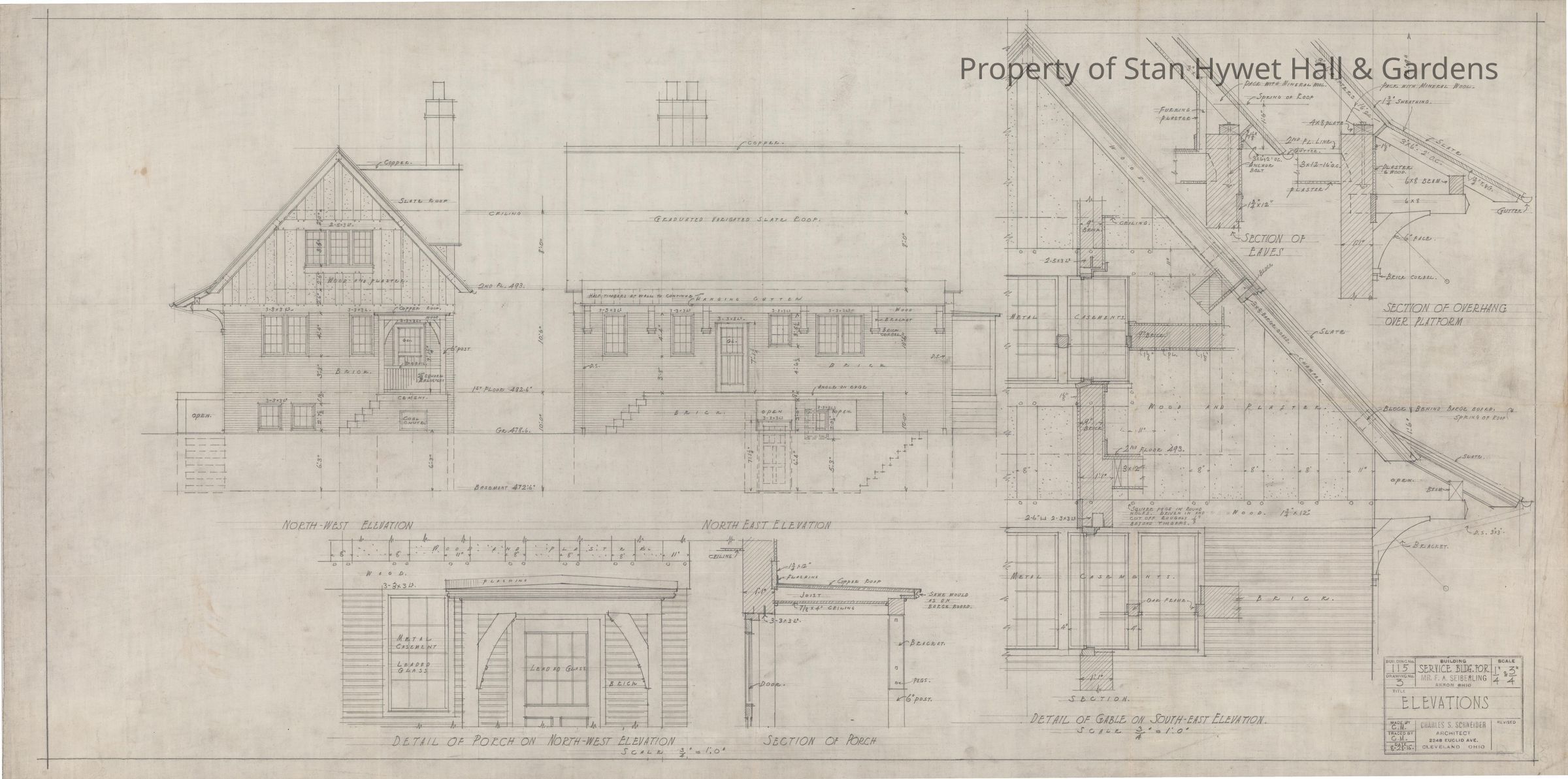 Historic Drawing: Northwest and northeast elevation of Gardeners Cottage. Drawing also includes detail drawings of southeast gable, porch, eaves, and overhang. Titled "Elevations".