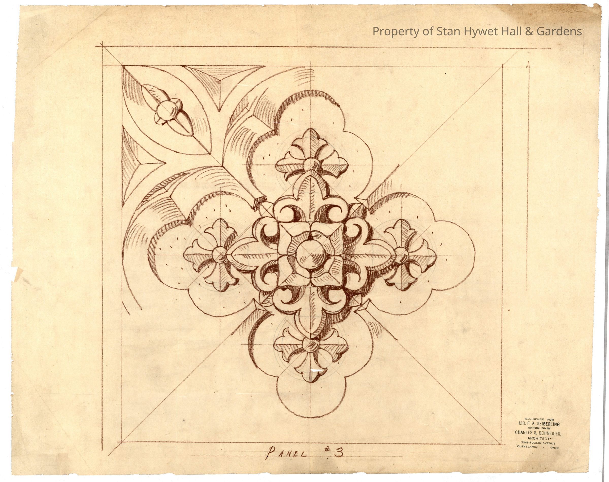 Historic Drawing: Full sized detail of the stonework carving design for the Great Hall fireplace in Stan Hywet Hall. Titled "Panel #3".