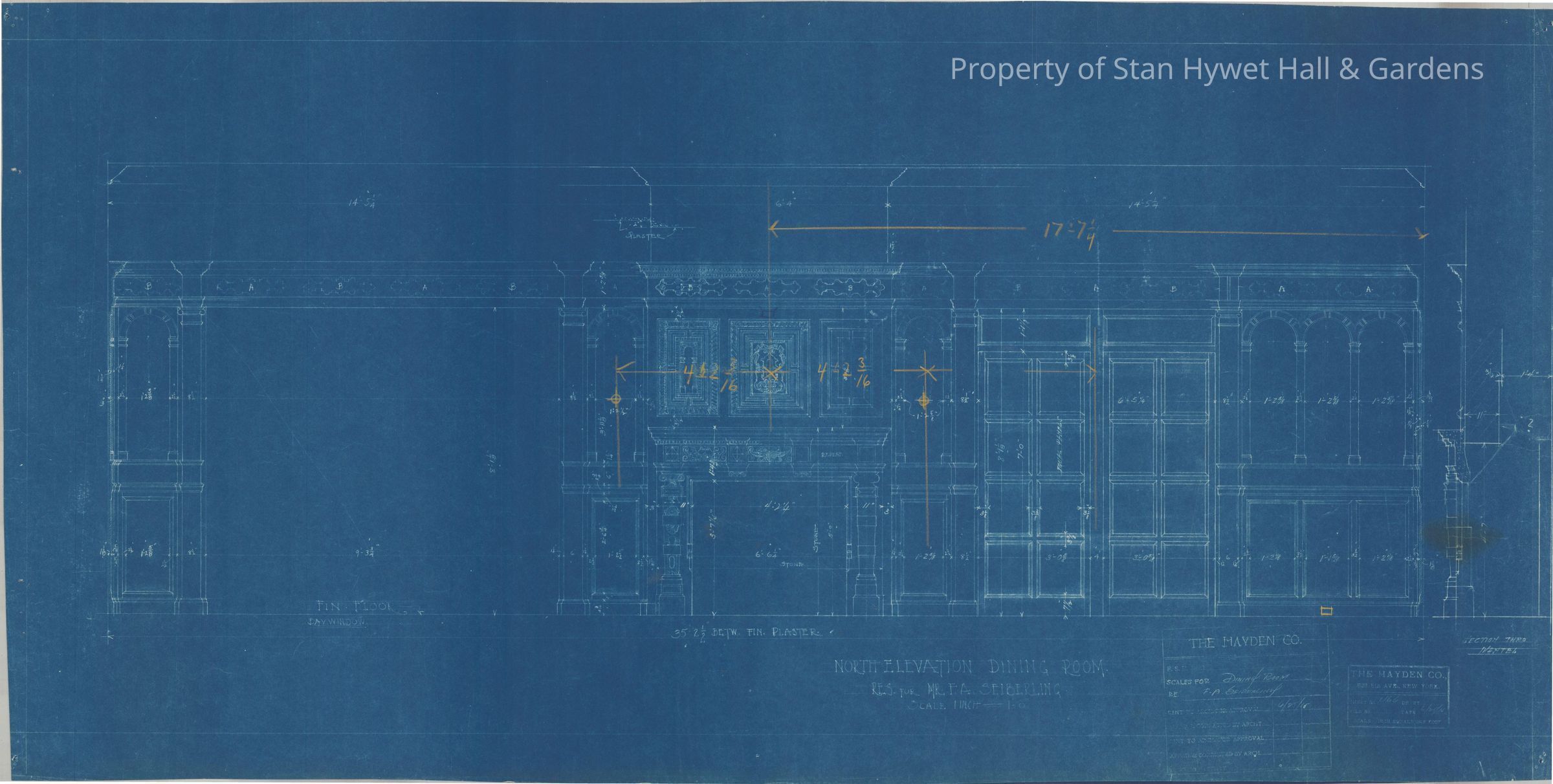 Historic blueprint: North elevation of the Dining Room in Stan Hywet Hall. Includes fireplace.
