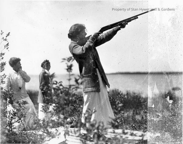 Black and white photograph of a young woman standing on wooden platform aiming a shotgun with two other young women in left background. All wear light colored dresses or skirts with button-down sweaters. Water in background. Series of shooting photos.Photograph Details