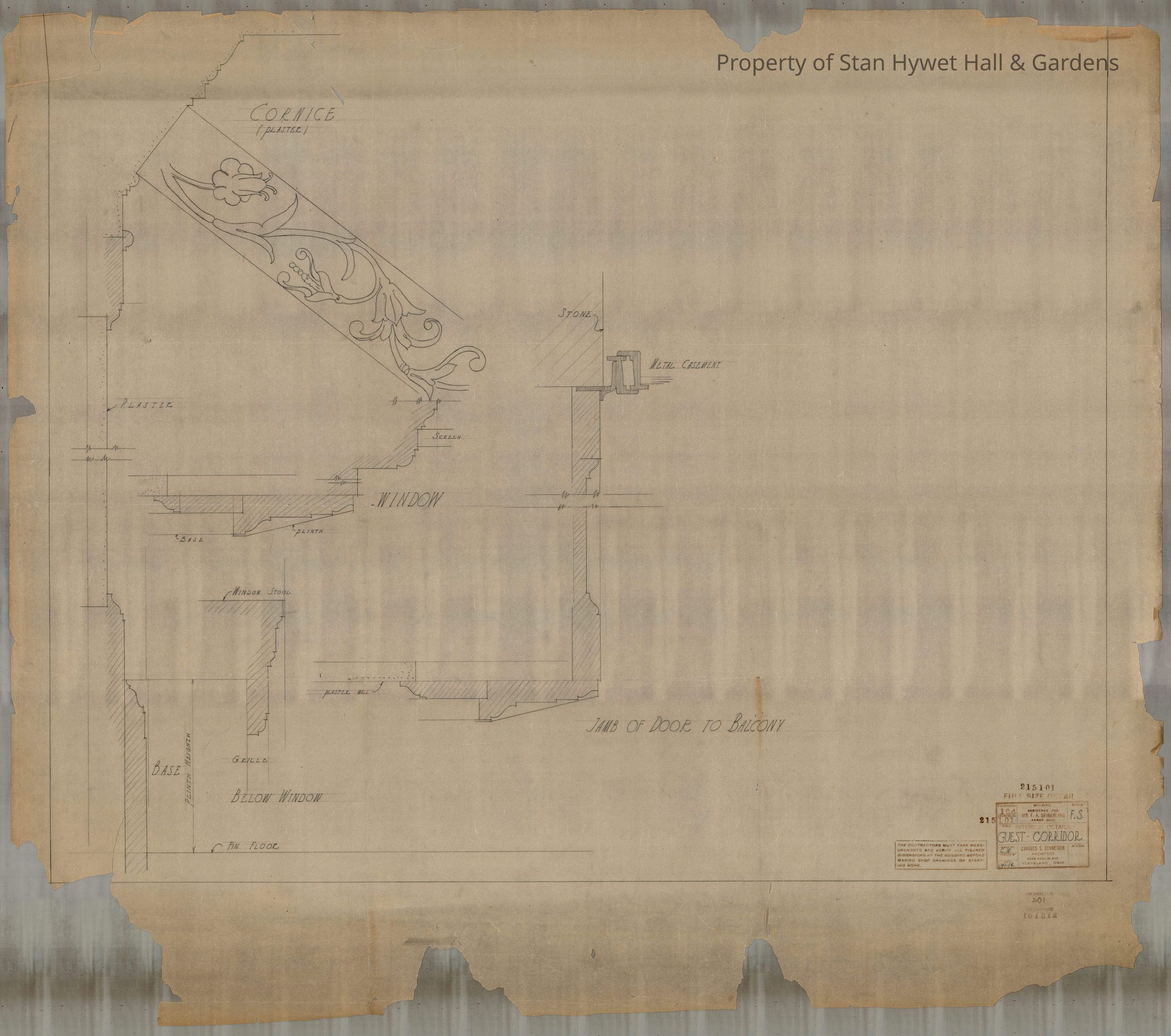 Historic drawing: details showing Jamb of door to balcony, window, and cornice in guest hallway