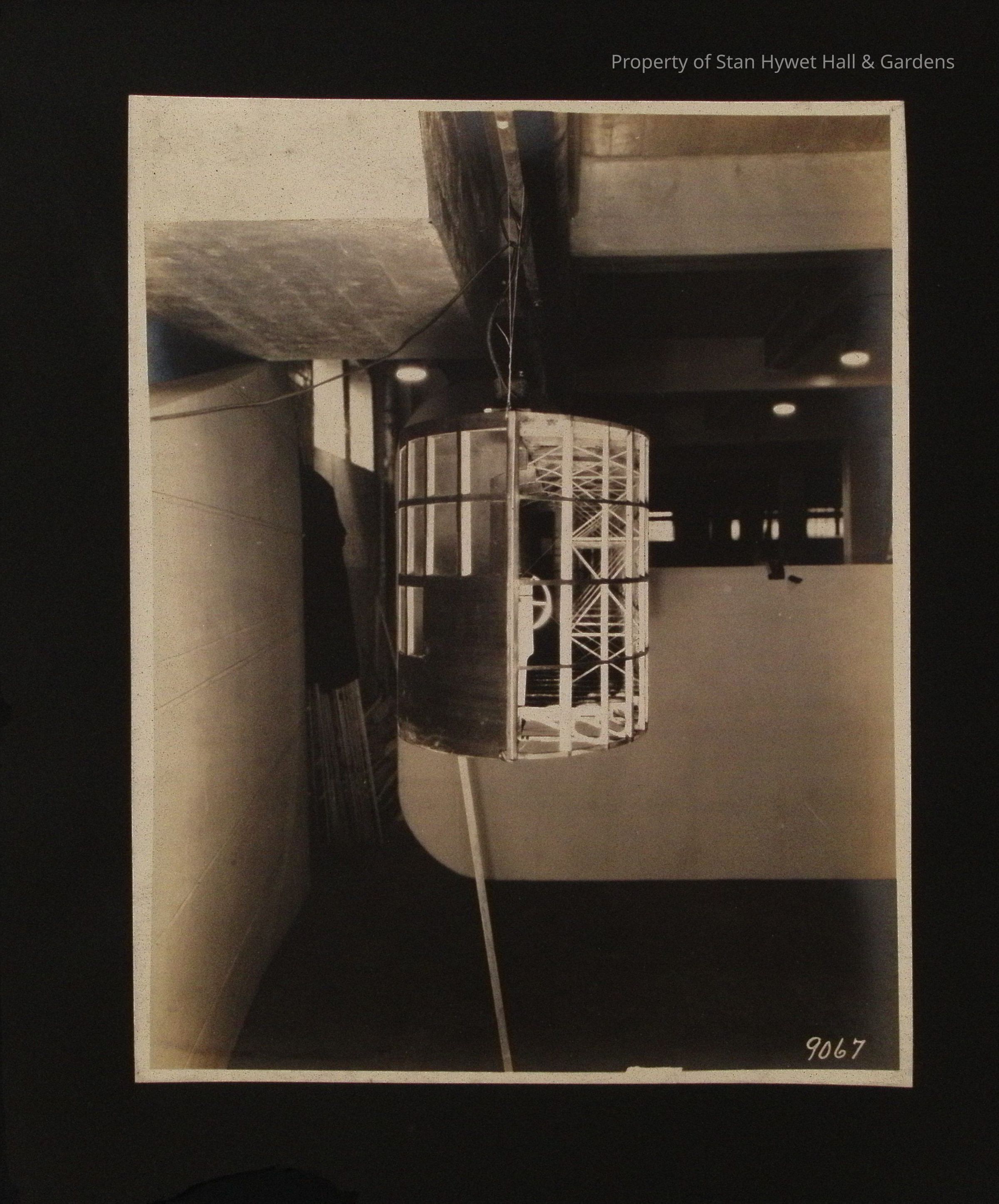 Black and white photograph of the end of a prototype of an airship gondola. Prototype is suspended from a pipe in the ceiling. The left side of the prototype is finished and the right side is open showing the construction of the piece. Photograph appears to be taken in a below ground room.