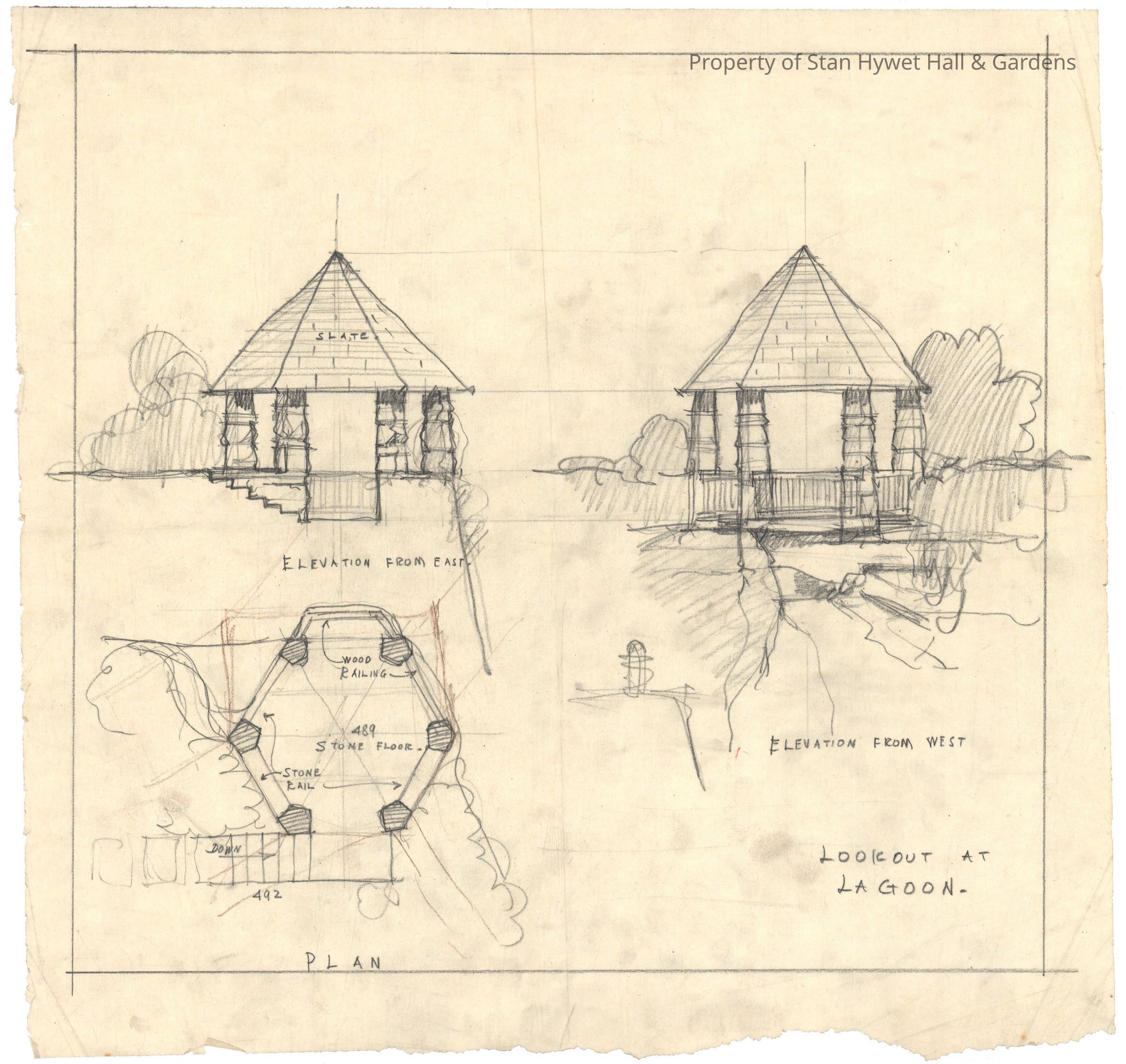 Historic drawing: Tea House concept sketches of east and west elevations and plan (lookout at the lagoons)Collection
