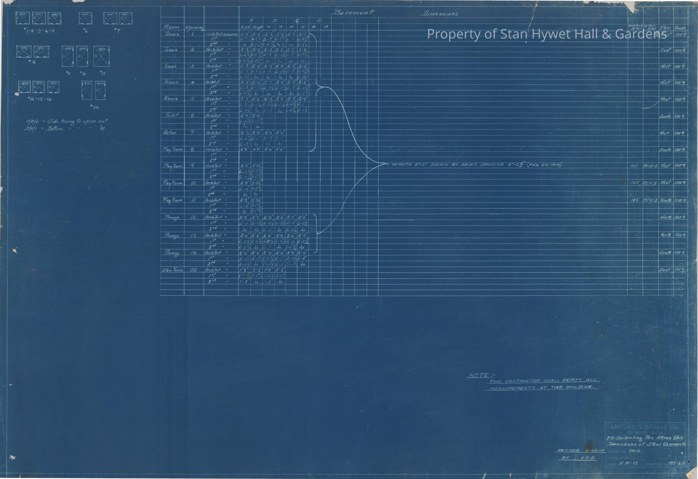 Historic Blueprint: Table detailing dimensions of steel casements for lower-level room windows 1-14, and 50. Titled "Dimensions of Steel Casements".
