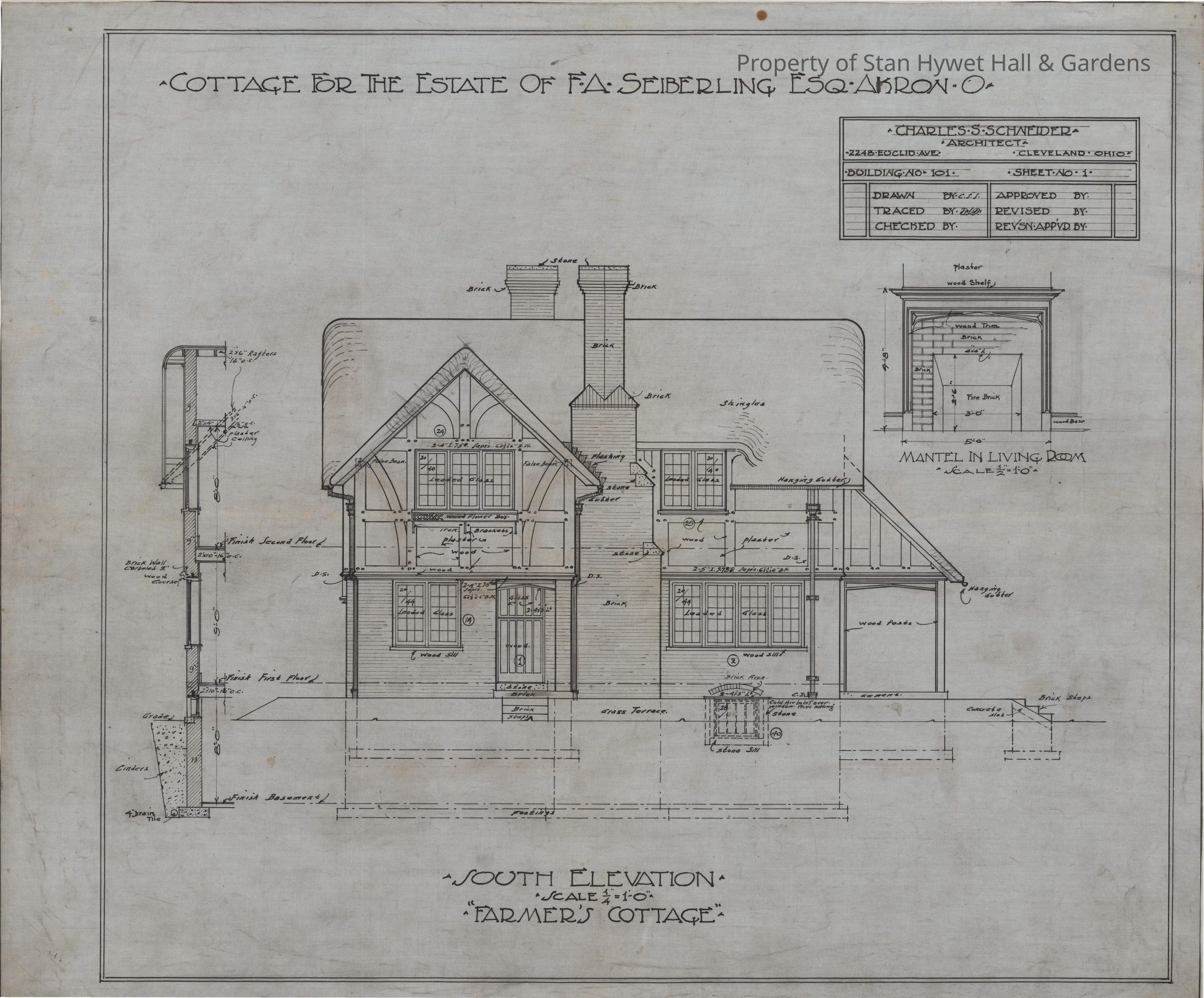 Historic architectural drawing: South elevation of Farmer's Cottage, includes detail of mantel in living room.