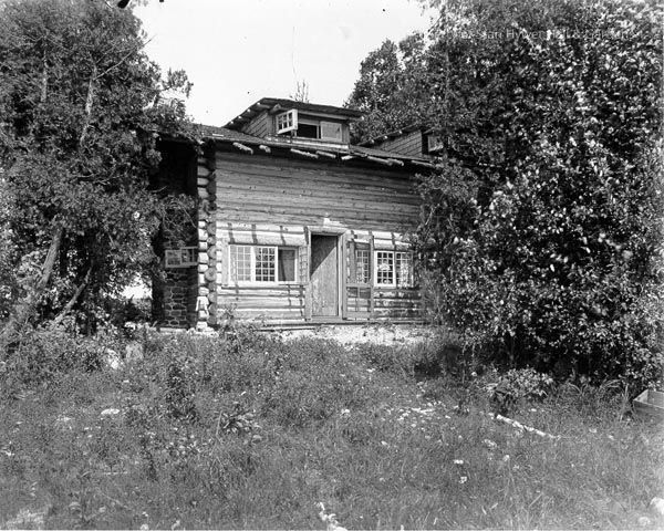Black and white photo of the Shore at Cedar Lodge. First floor window is open to left of door which is also open as well as the windows on the side next to the chimney. A 2nd floor window is also open. Trees and foliage surround them.Photograph Details