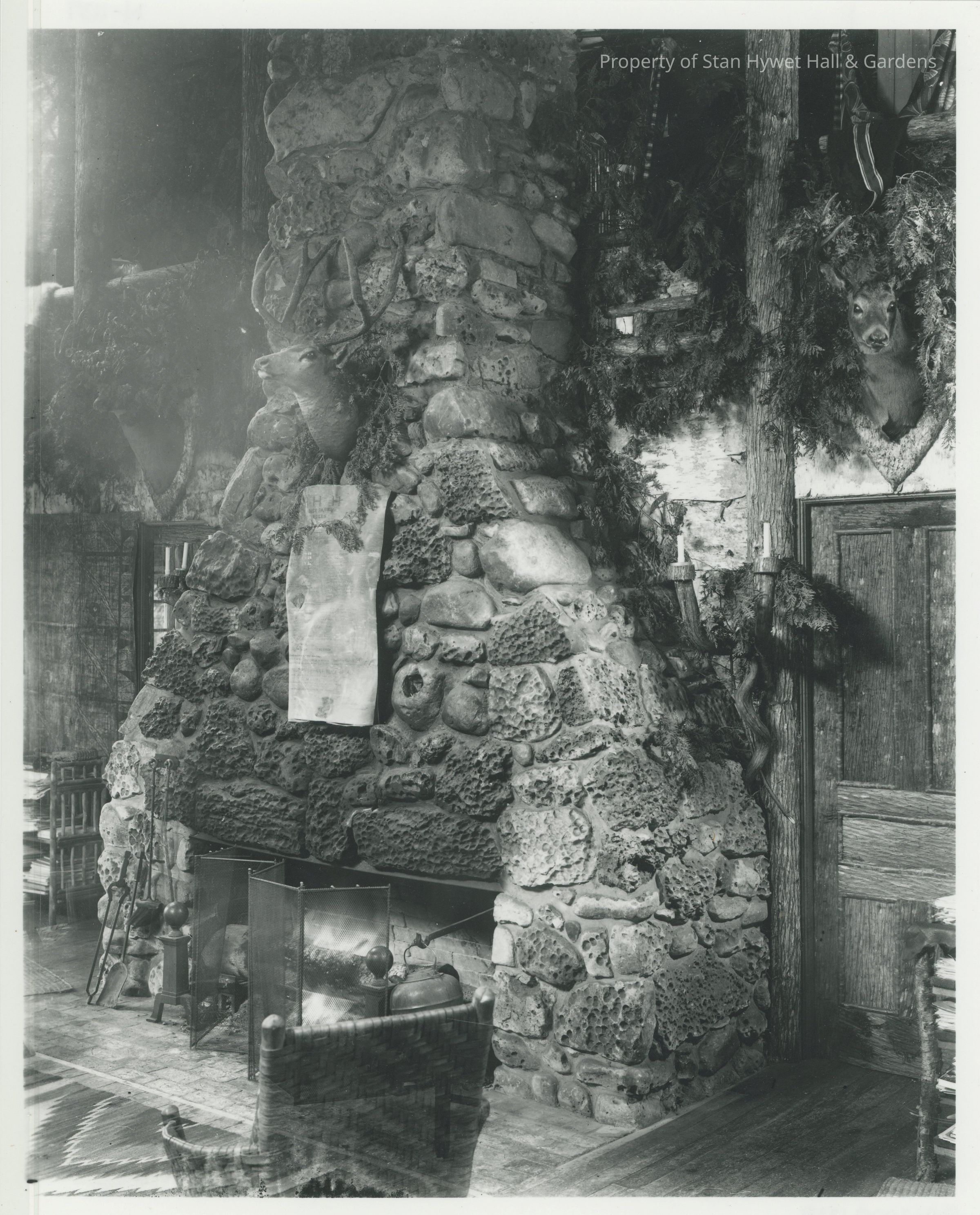 Black and white photograph of the stone fireplace in Main Cabin at Cedar Lodge. Mounted deer head at top center of fireplace, a pair of mounted deer heads flanking area below balcony, tree branch sconces either side of fireplace, fire tools and screen in front of hearth. "HHH House Party Rules" sheet of paper tacked below deer head above hearth. Woven chair with curved arms in foreground (appears to have been superimposed). Much garland strung about, part of door visible at far right.Photograph Details