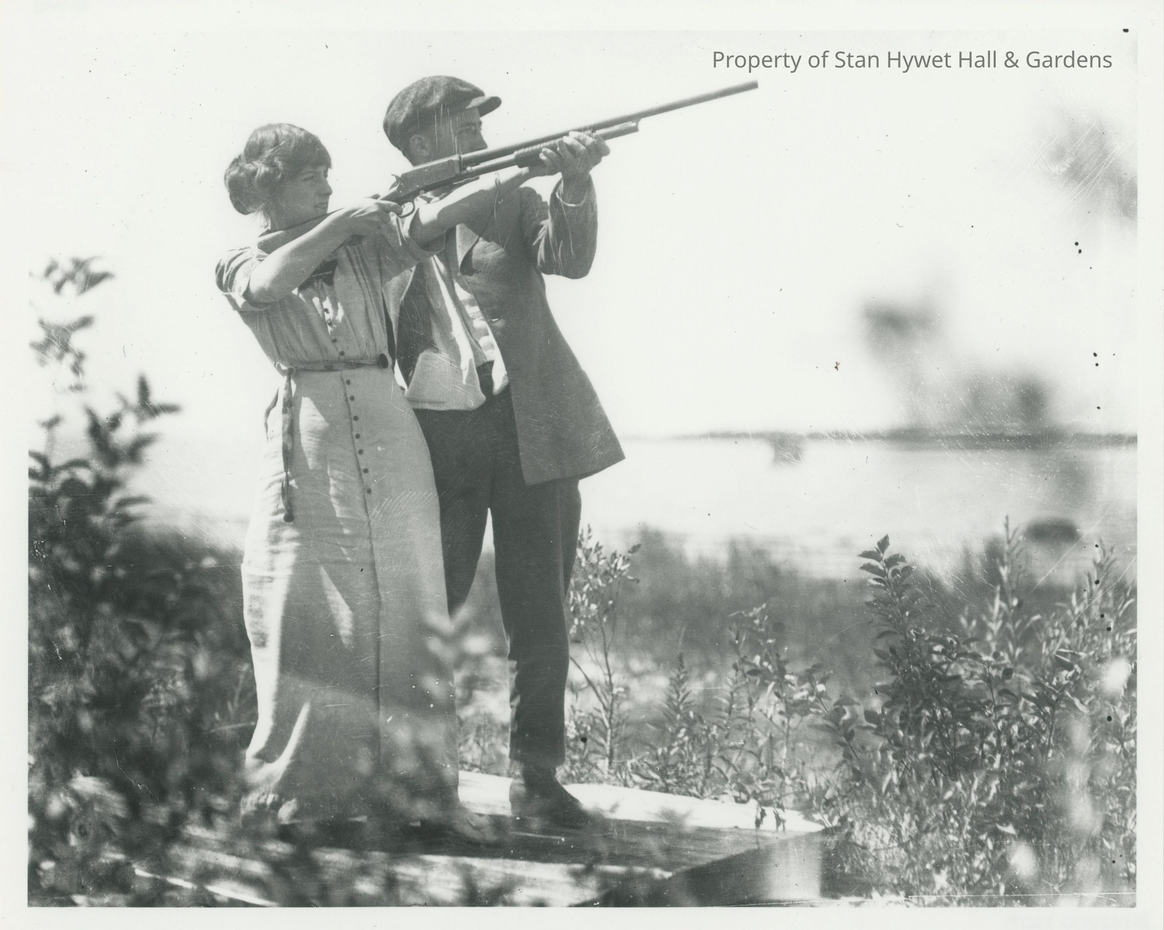 A man instructs a woman how to shoot a shotgun. Both stand on a wooden platform. Water in background. Man wears hat, sweater, white shirt, jacket and trousers. Woman wears a buttoned down dress with a sash belt. Series of shooting prints.Photograph Details