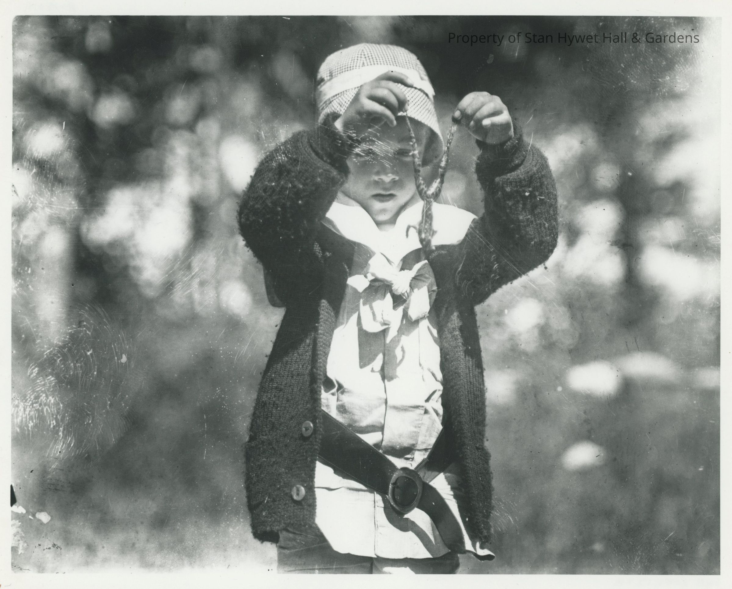 Black and white photograph of an unidentified young child (approximately five yrs old) holding a frog upside-down. Child faces camera, stares at toad, holds it with one leg in each hand. Child wears checkered hat with white band, dark sweater, white shirt with bow in front, large black belt, and white pants. Frog is speckled, stomach faces child and eyes faces camera. Child and toad in foreground; background out of focus, appears to be trees.Photograph Details