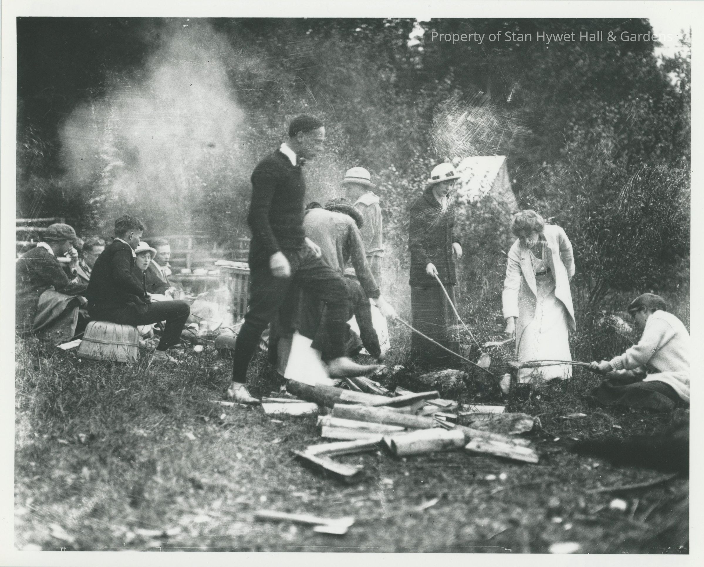 Group of unidentified people, fifteen total, sit around campfires in the woods of Cedar Lodge. The foreground contains a small axe with a small pile of firewood behind it. A group of eight adults gather around the first fire. Starting in the front and going clockwise: man wears light collared shirt, dark sweater, and dark pants, light shoes; second person wears a hat, sweater, and bends over holding a stick in the fire; third is hidden; fourth man sits wears hat and light shirt; fifth woman wears hat, light dress and sweater; sixth wears a hat, light blouse, dark skirt and jacket, holds a stick; seventh woman wears light dress and light sweater holds stick in fire; eighth person sits holding a stick wears hat sweater and a blanket over their legs. Left background is a group of seven children sitting around another fire. Clockwise; boy sits Indian style[hidden by man standing in foreground]; boy sits on peach basket wears dark jacket and pants.Photograph Details