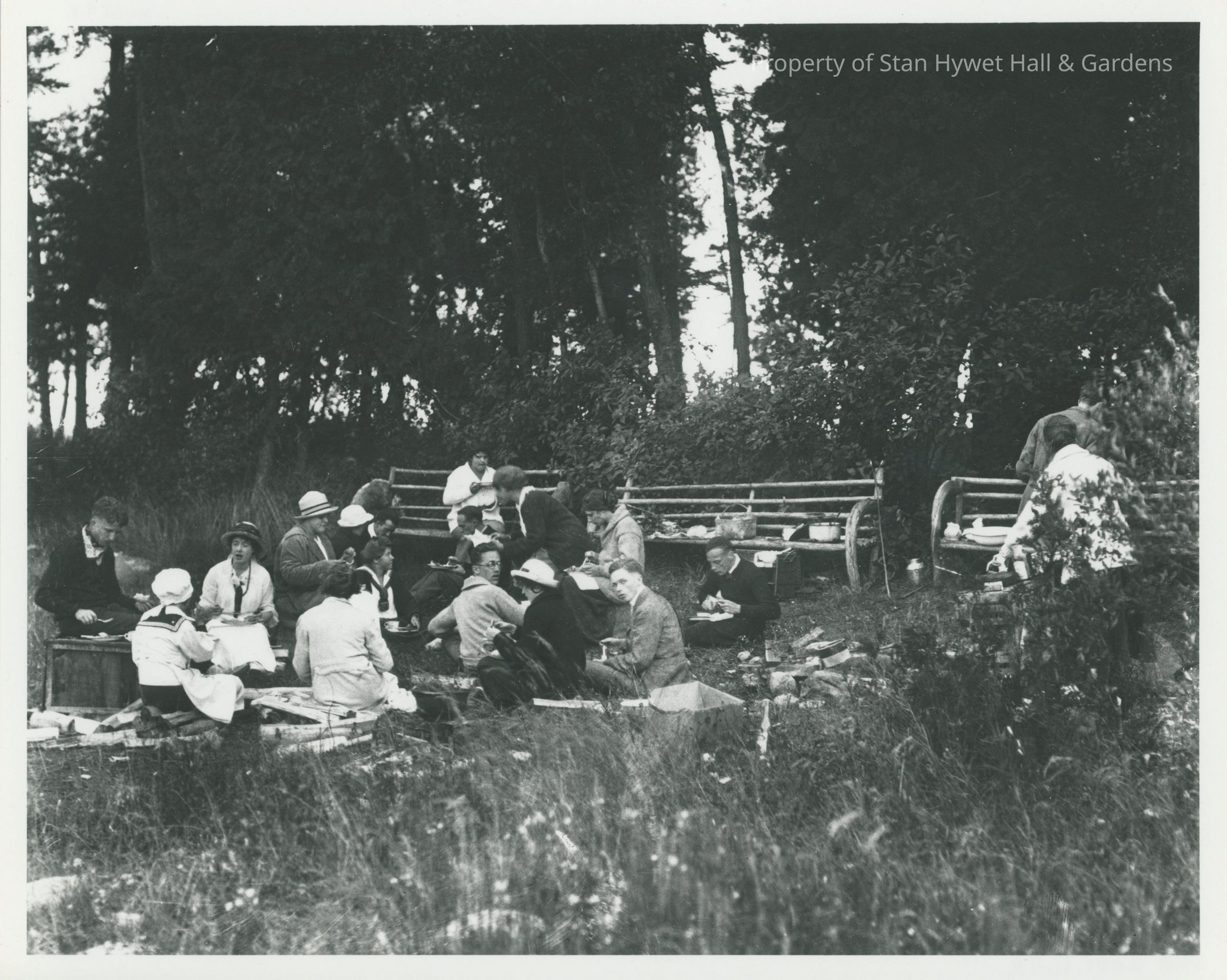 Black and white photographic print of a group of seventeen unidentified people sitting in the woods at Cedar Lodge having a picnic. The females wear dresses, hats, and sweaters, while the males wear sweaters or suit jackets. They sit in a field of grass; high grass in foreground. Three wooden benches are at the back of the small grassy field. They start in the middle and run of the image to the right. Woman sits on left most bench while food, pots, and baskets are on the others. Short trees and bushes fill the area behind the benches, while trees, full of leaves, fill the background behind them.Photograph Details