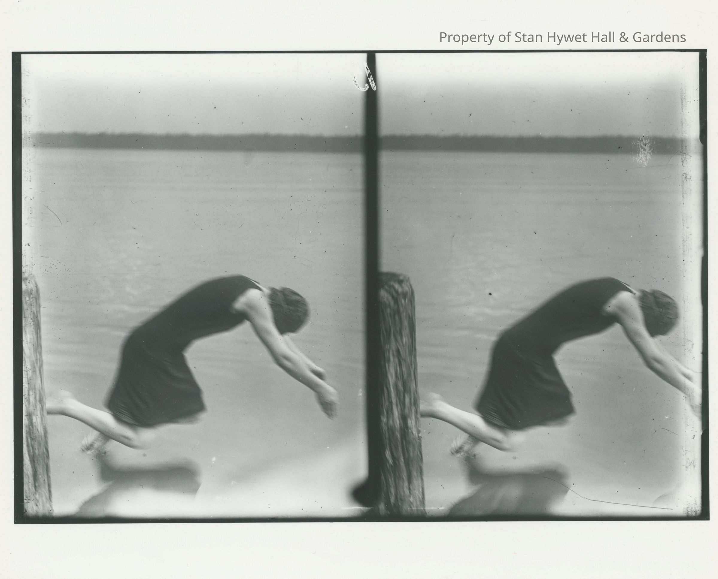 Black and white stereograph image of an unidentified woman diving into the water at one of the Hessel properties. Woman wears dark swimsuit, arches body as she dives to the right. Part of wooden pole visible in left side of image. Water in background behind woman, tree line visible beyond water.Photograph Details