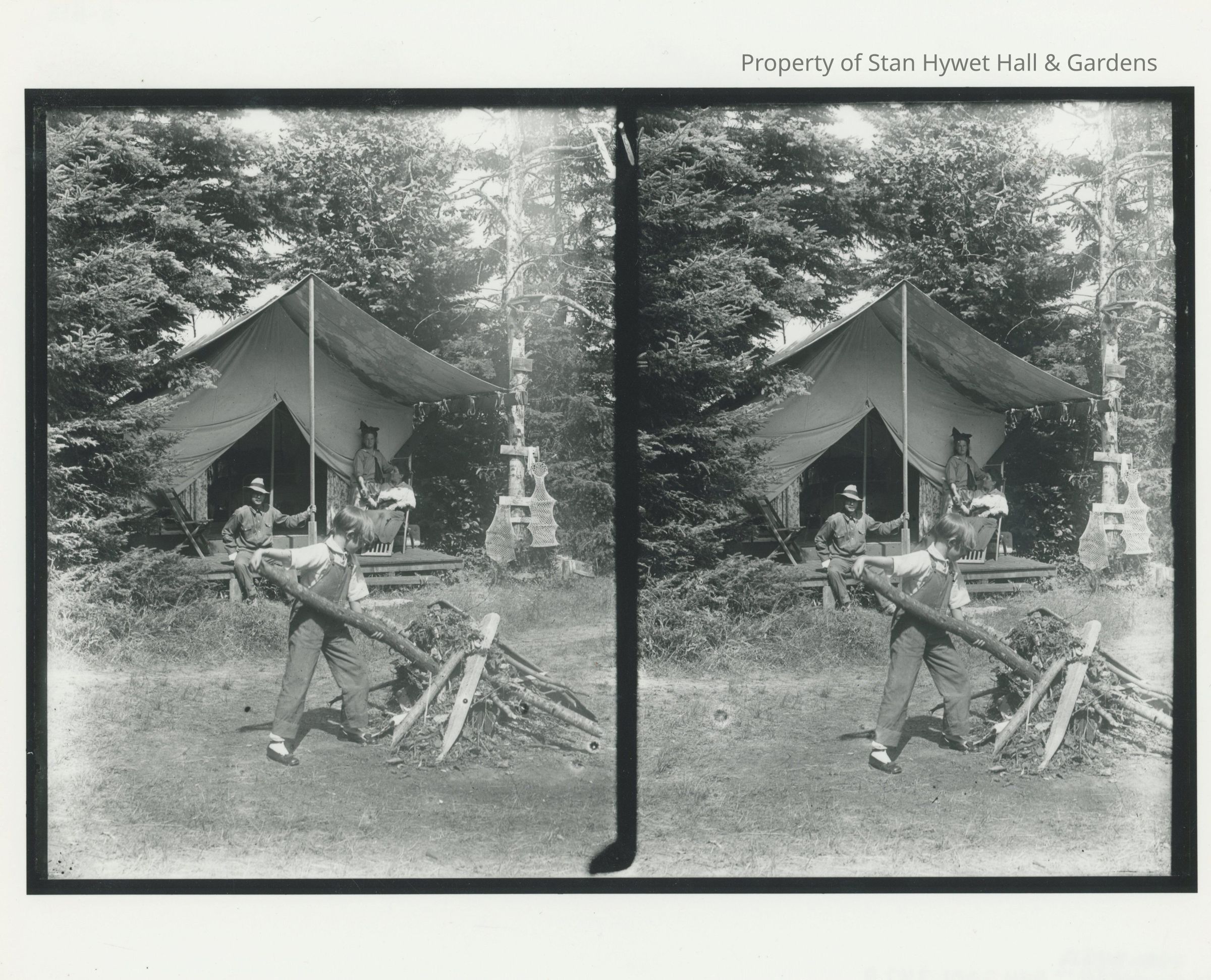 Black and white stereograph image of the William Chase family at Camp Wildwood. William, Grace, and daughter Olga are on the porch outside their tent while other daughter, Ellen, plays with sticks for the camp fire. From foreground to background: Ellen wears a light shirt and overalls; William Chase, sitting on porch, wears matching long-sleeved shirt and pants and a hat; Grace Chase, sitting in chair, wears light colored blouse and a dark skirt; Olga, standing holding her mom's hand, wears a dress and a big bow in her hair. To the right of the tent is a tree with two nets hanging from it. Trees in the background surround the tent. Series of Camp Wildwood prints.Photograph Details