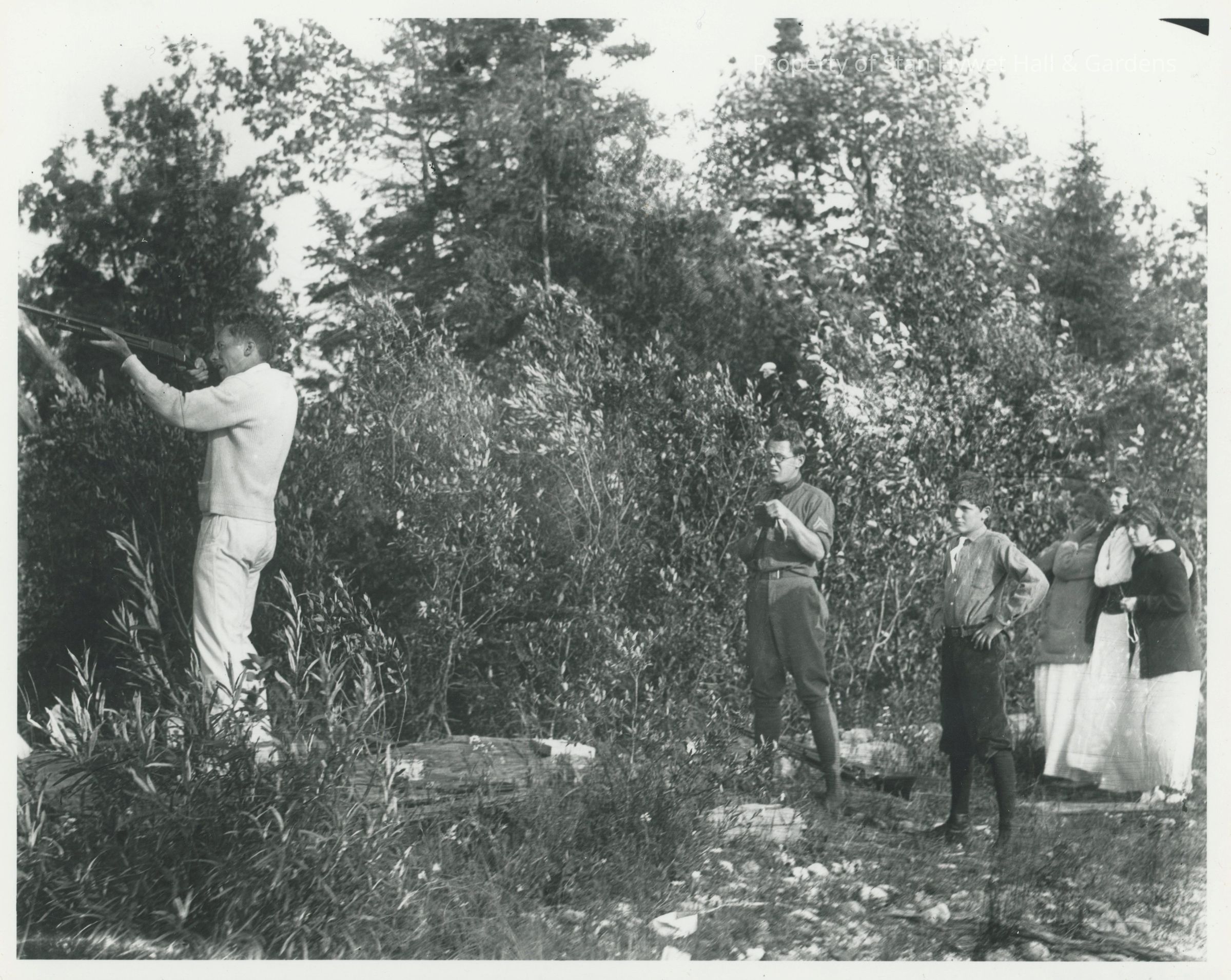 Print developed from gelatin dry plate glass negative. Young man, boy and three young women watch man shooting rifle. Man shooting rifle stands on wooden platform on far left, wears pants and sweater. Young man near center stands, wears Army uniform, holds his hat. Boy stands, wears tie, shirt, knickers, and knee socks. Women stand grouped on far right, wear dresses and sweaters; woman on left plugs ears. Rifle rests on ground behind man in uniform. Grasses in foreground and trees in background. Series of shooting prints.Photograph Details