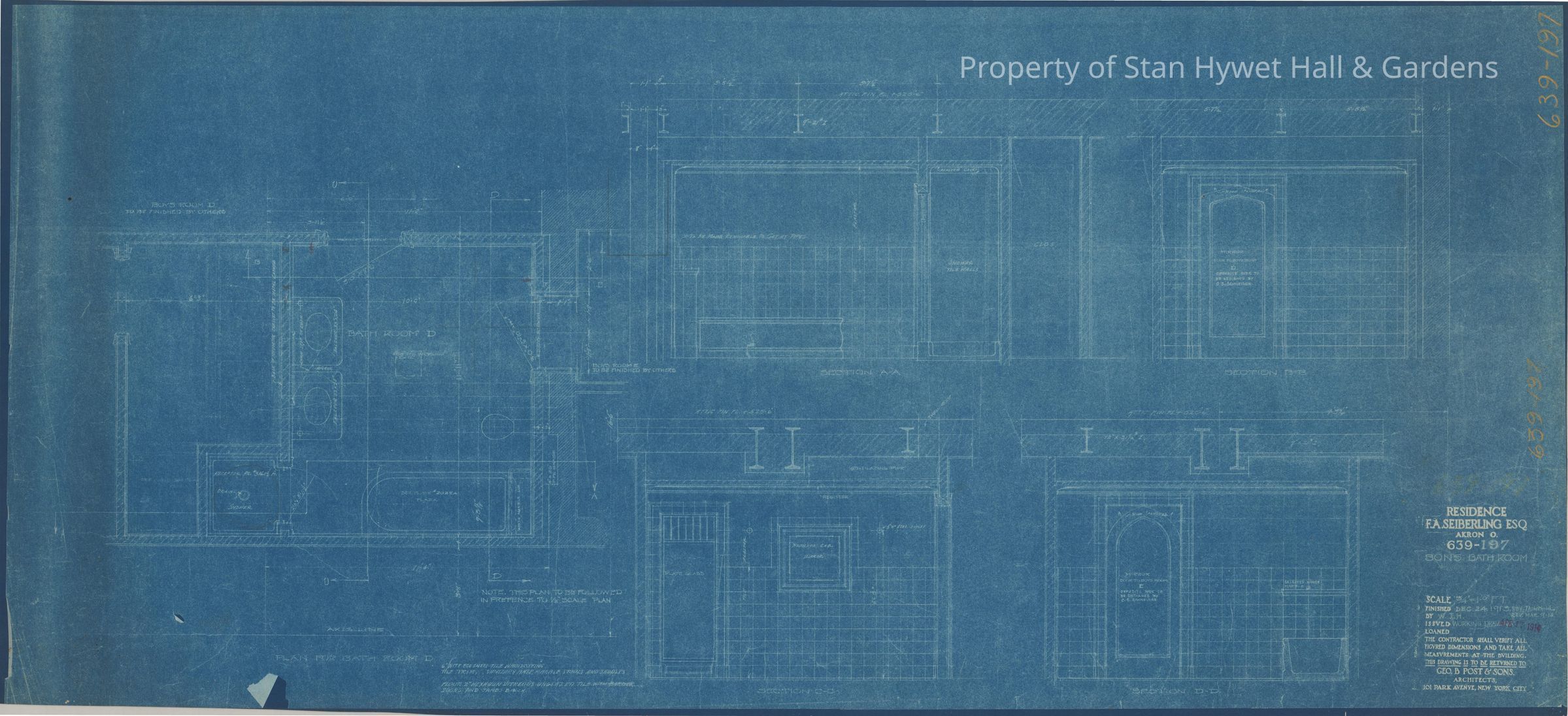 Historic Blueprint: Plan and elevations of Boys' bathroom in Stan Hywet Hall. Titled "Sons Bathroom".