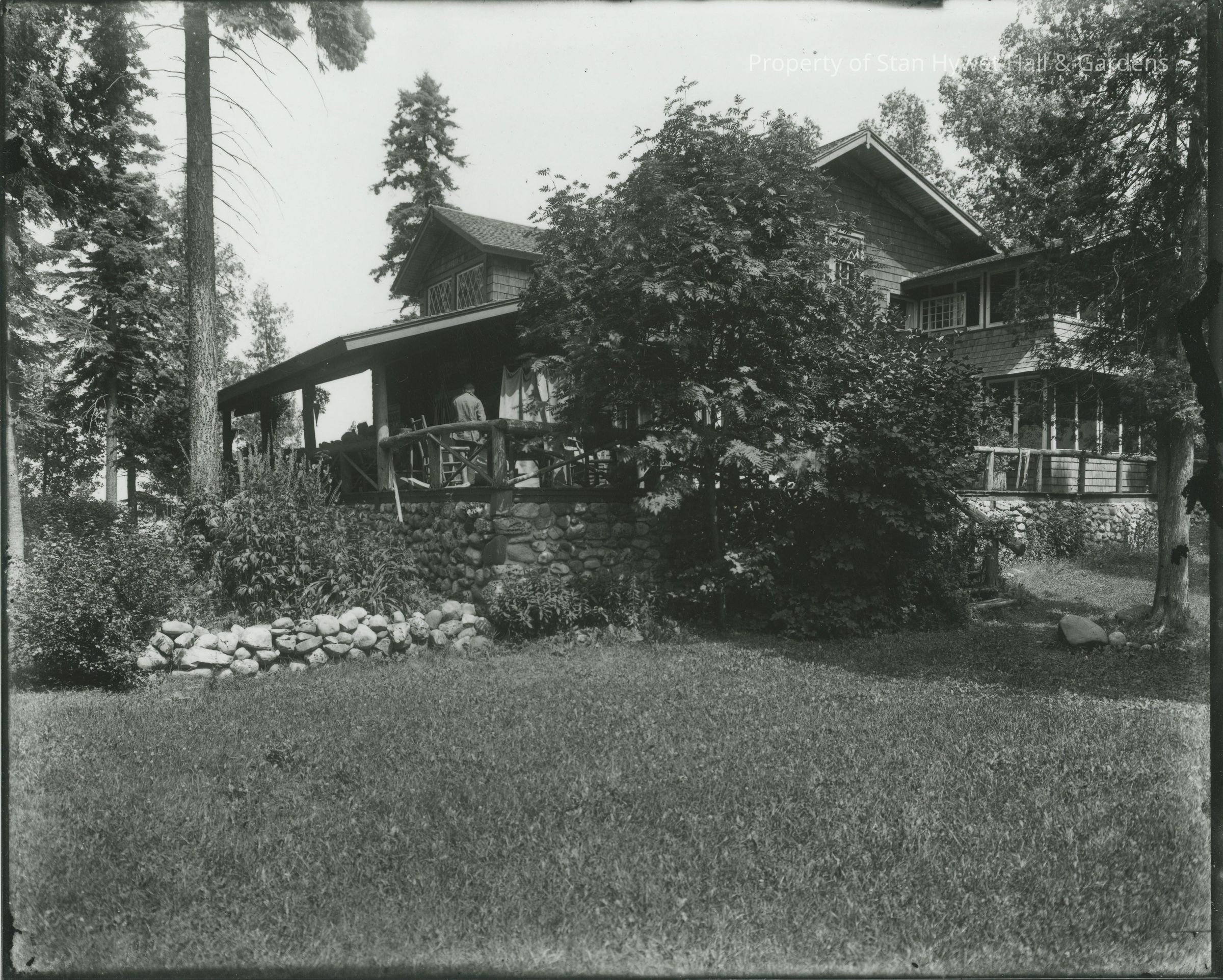 Black and white print of the main cabin at Cedar Lodge, Seiberling summer home in Hessel, Michigan, view taken of rustic style lodge from grassy area, with man and rocking chair on porch, shingles covering façade, lattice work in windows, stone wall supports porch with low stone wall at garden bed below, fir trees and other plant materials around.Photograph Details
