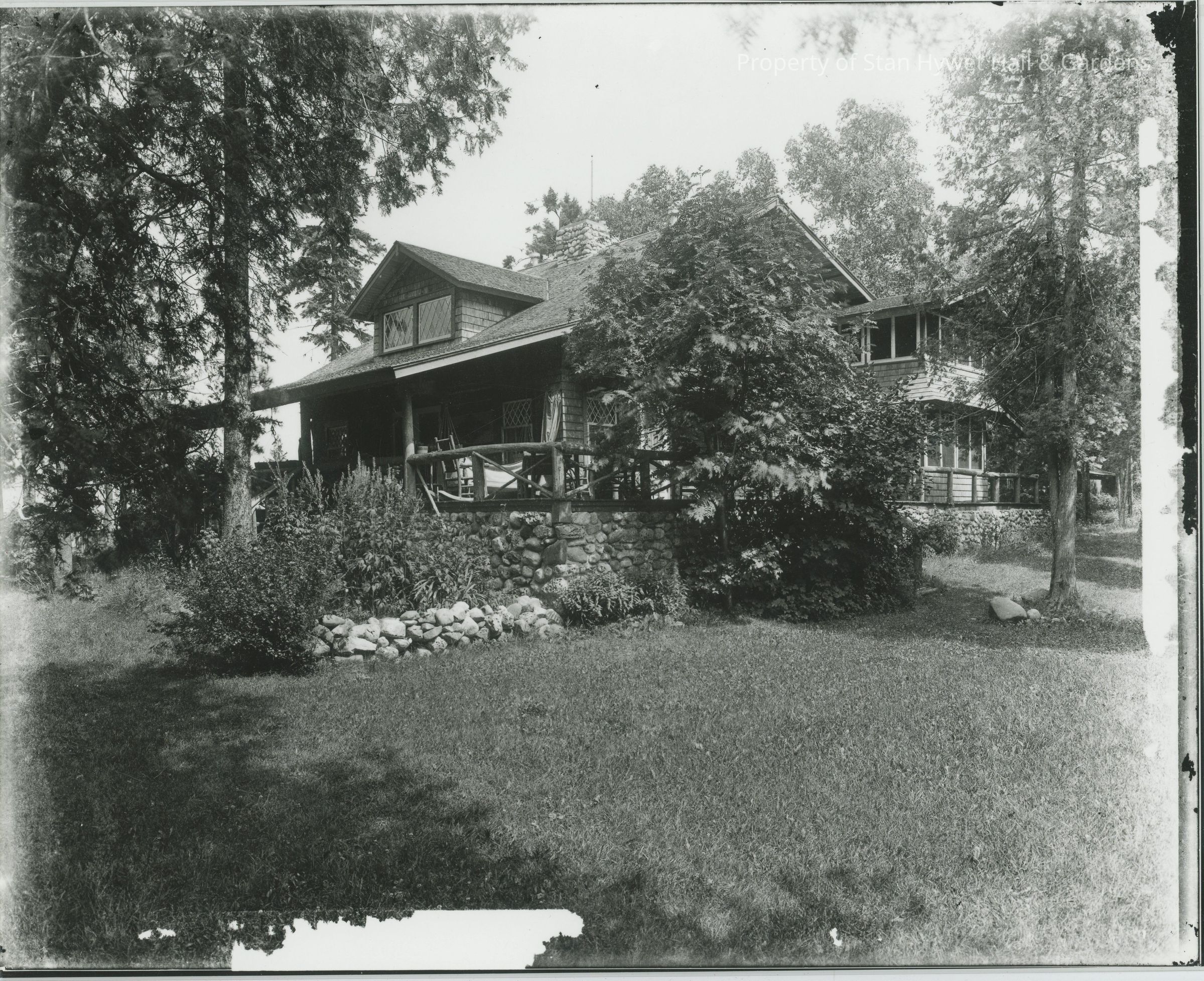 Black and white photograph of the Main Cabin at Cedar Lodge. Rocker and other furniture on porch, stone wall surrounds garden bed below, trees surround. Very similar image to SHH 95.400.Photograph Details