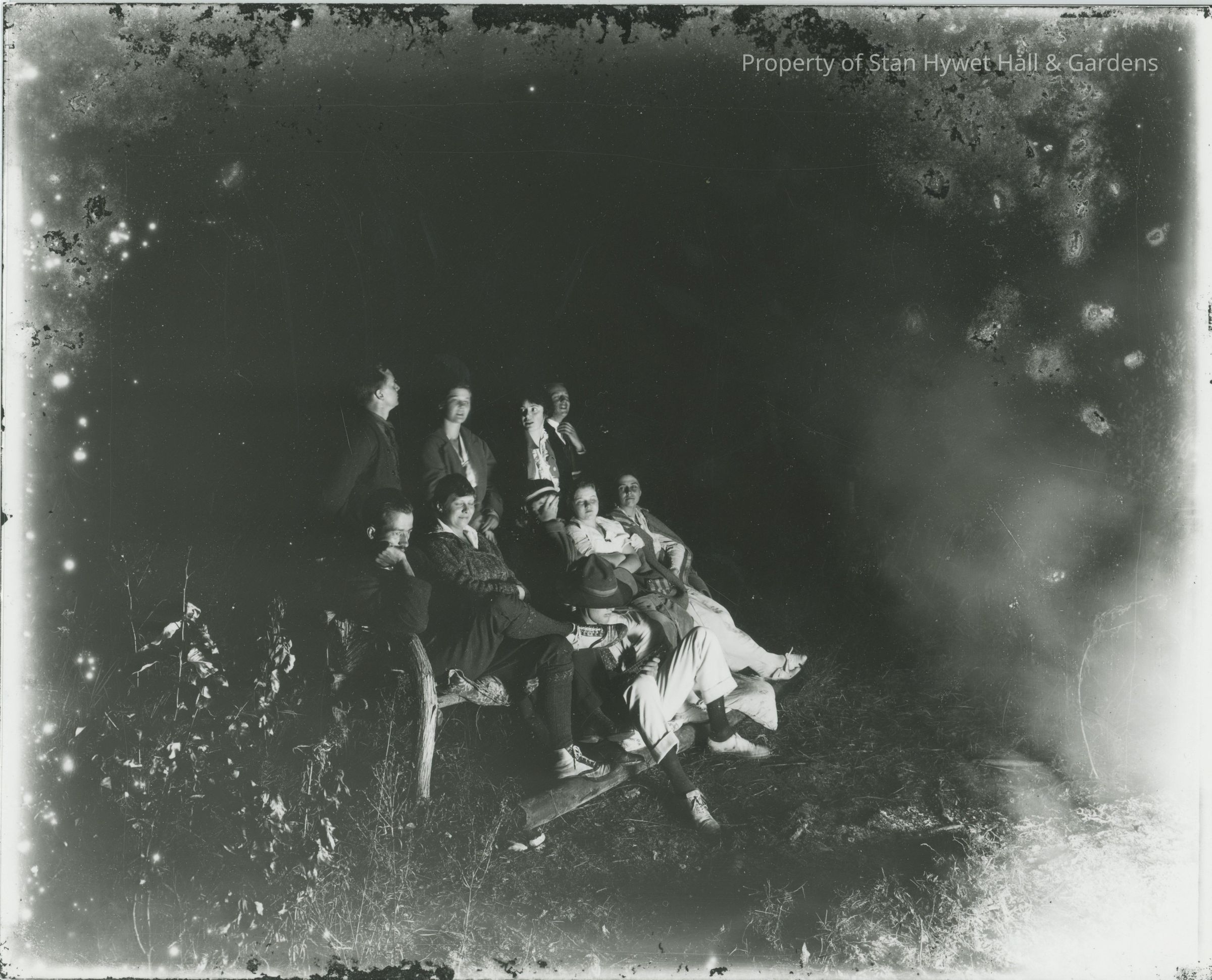 Printed to reveal image taken at Cedar Lodge, Seiberling summer home in Hessel, Michigan, view of ten people sitting and standing in a group in front of a camp fire which is not visible but located to right in image, casting light on group, darkness surrounds, girl second from right seated is probably Virginia Seiberling.Photograph Details