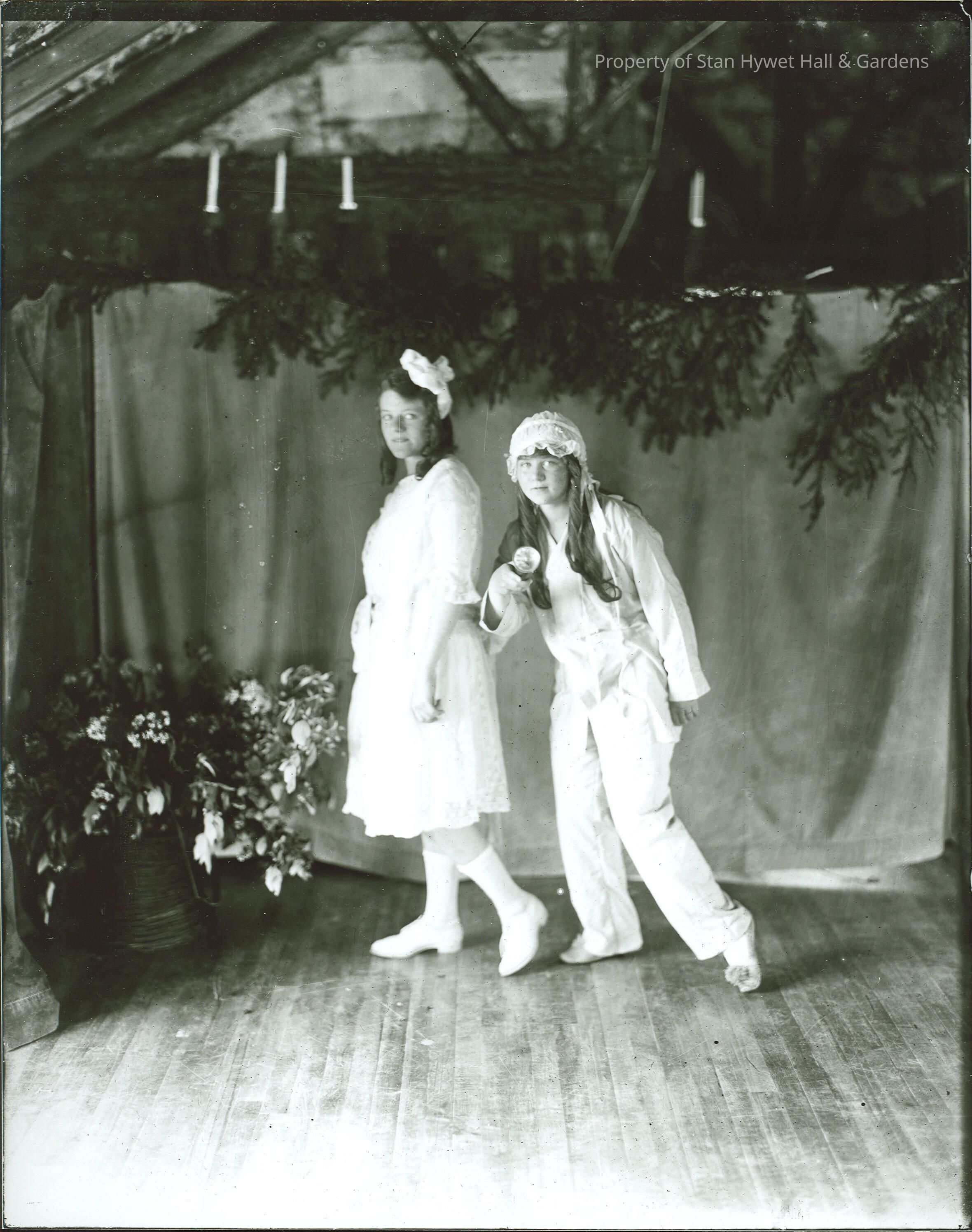 Gelatin dry plate glass negative: printed to reveal image taken at Cedar Lodge, Seiberling summer home in Hessel, Michigan, view of two young girls posed on area arranged as stage space with bare wood floor, jardinière to left, candle sconces at rear and curtain behind them. Girl on left wears short white lace dress, white socks and shoes and white bow in hair, long curls. Girl at right is Virginia Seiberling and she wear white nightclothes of blouse, pants, slippers and sleeping cap, long curls, and holds something that looks like a flashlight which she point out to camera. Both girls are looking at camera and slightly smiling. Image is very similar to SHH 96.407.Photograph Details