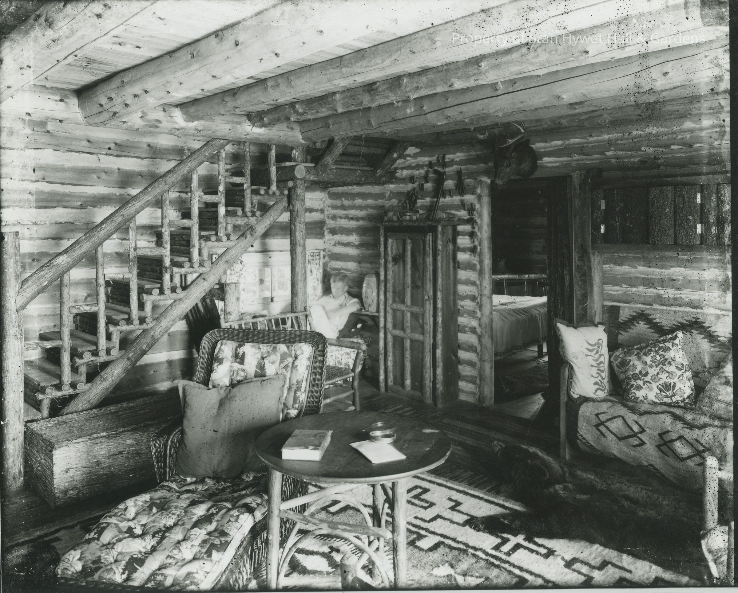 Black and white photograph of the living room of the Shore Cabin at Cedar Lodge. Rustic stairs to second floor at left, chaise lounge and round table in foreground, built-in settee at right, Native American rug on floor, Franklin reclining near the window, reading in the background, and view of bedroom through open door to right of image center.Photograph Details