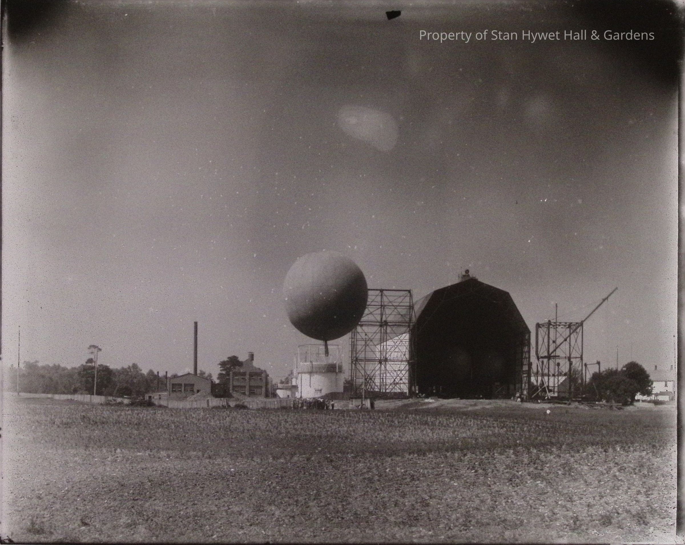 Print developed from gelatin dry plate glass negative. Balloon aloft outside hangar with doors wide open, men standing below balloon, factory like work buildings to left of hangar and farmhouse at distant right background. Landscape appears to be farmland.Photograph Details