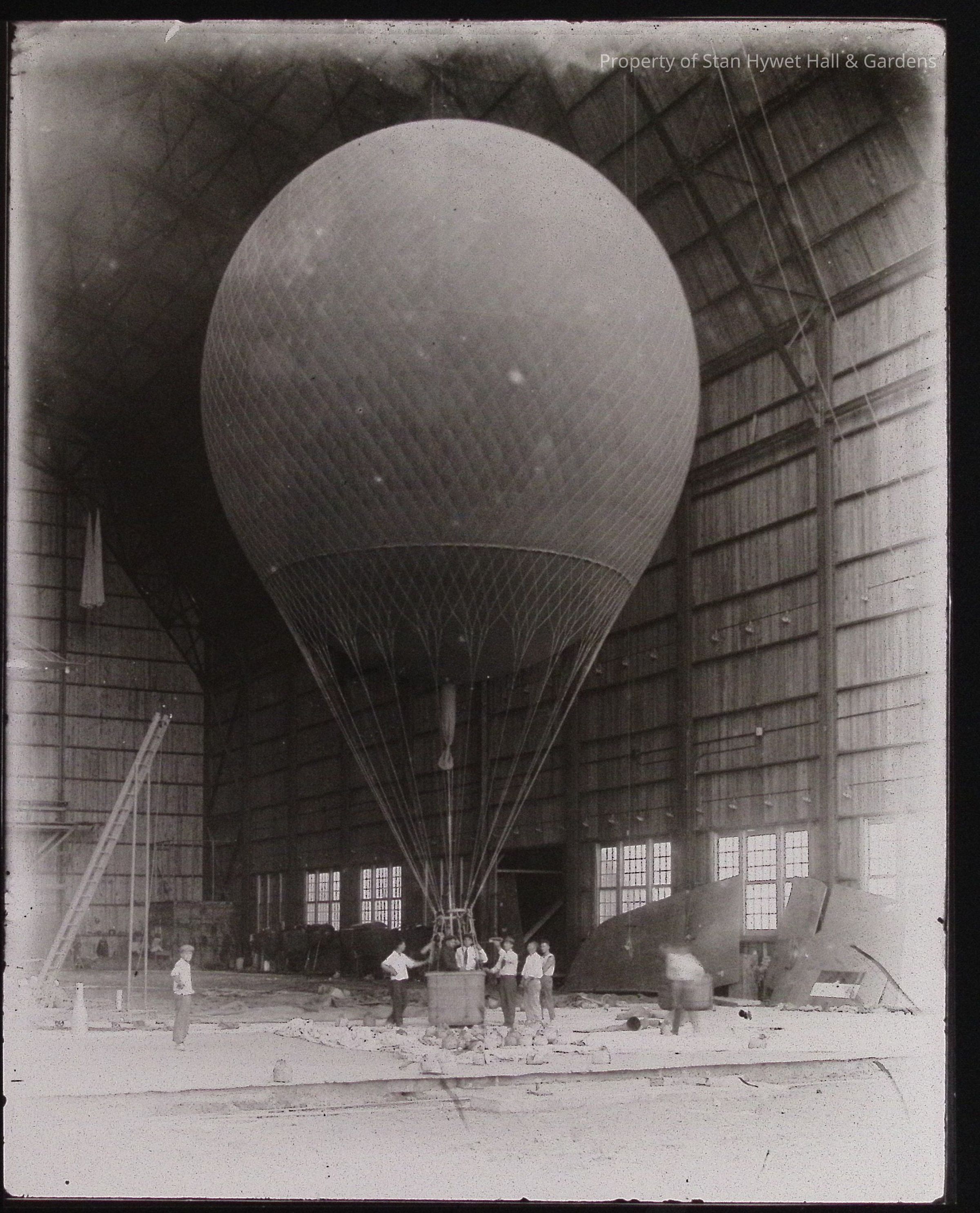 Print developed from gelatin dry plate glass negative. Round balloon with basket inside hangar with men standing around it and two men inside basket, sand bags around on the floor. (Similar image to SHH 96.393)Photograph Details