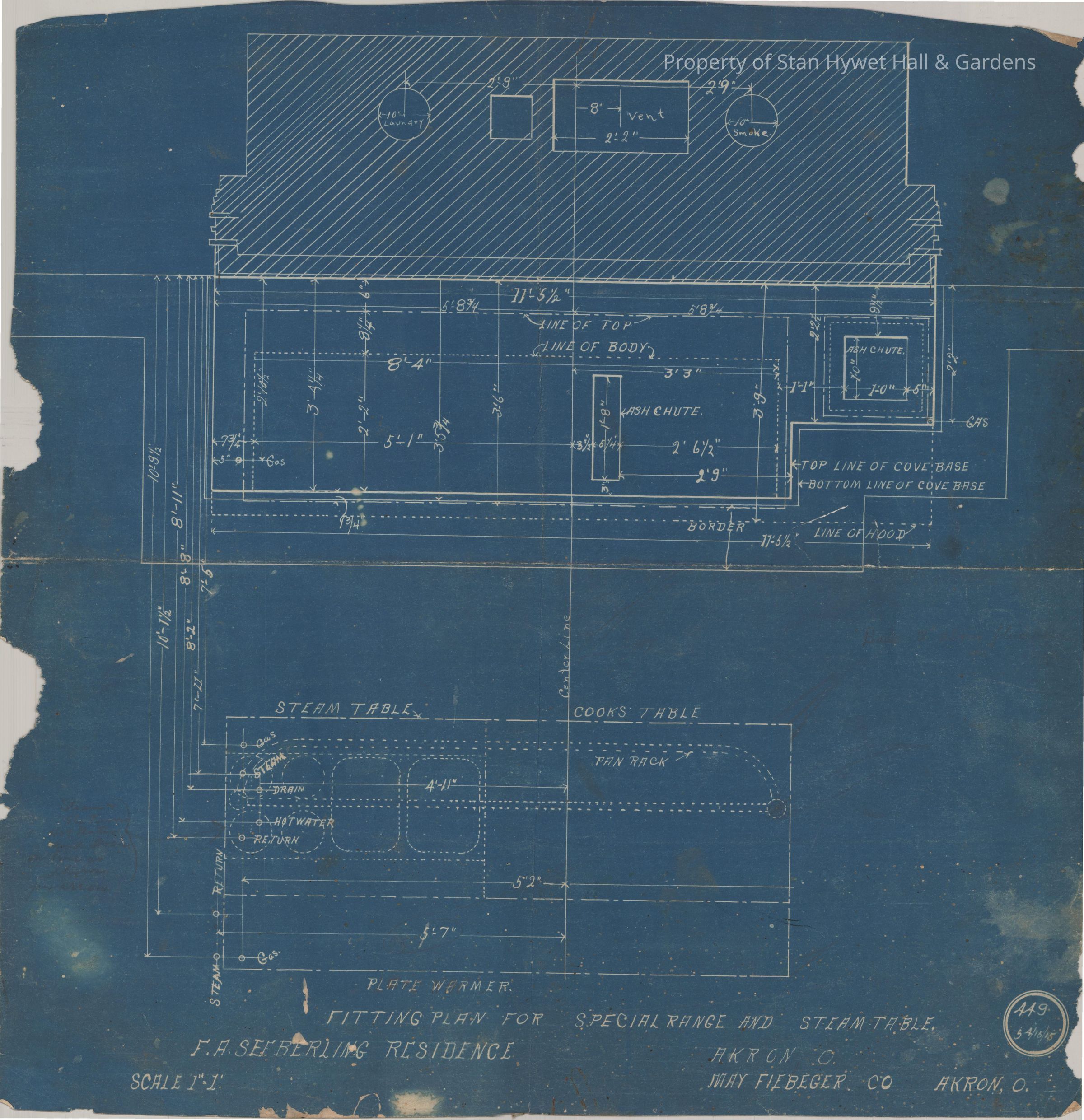 Historic blueprint: Detailed plan of the range and steam table. Titled "Fitting Plan for Special Range and Steam Table".