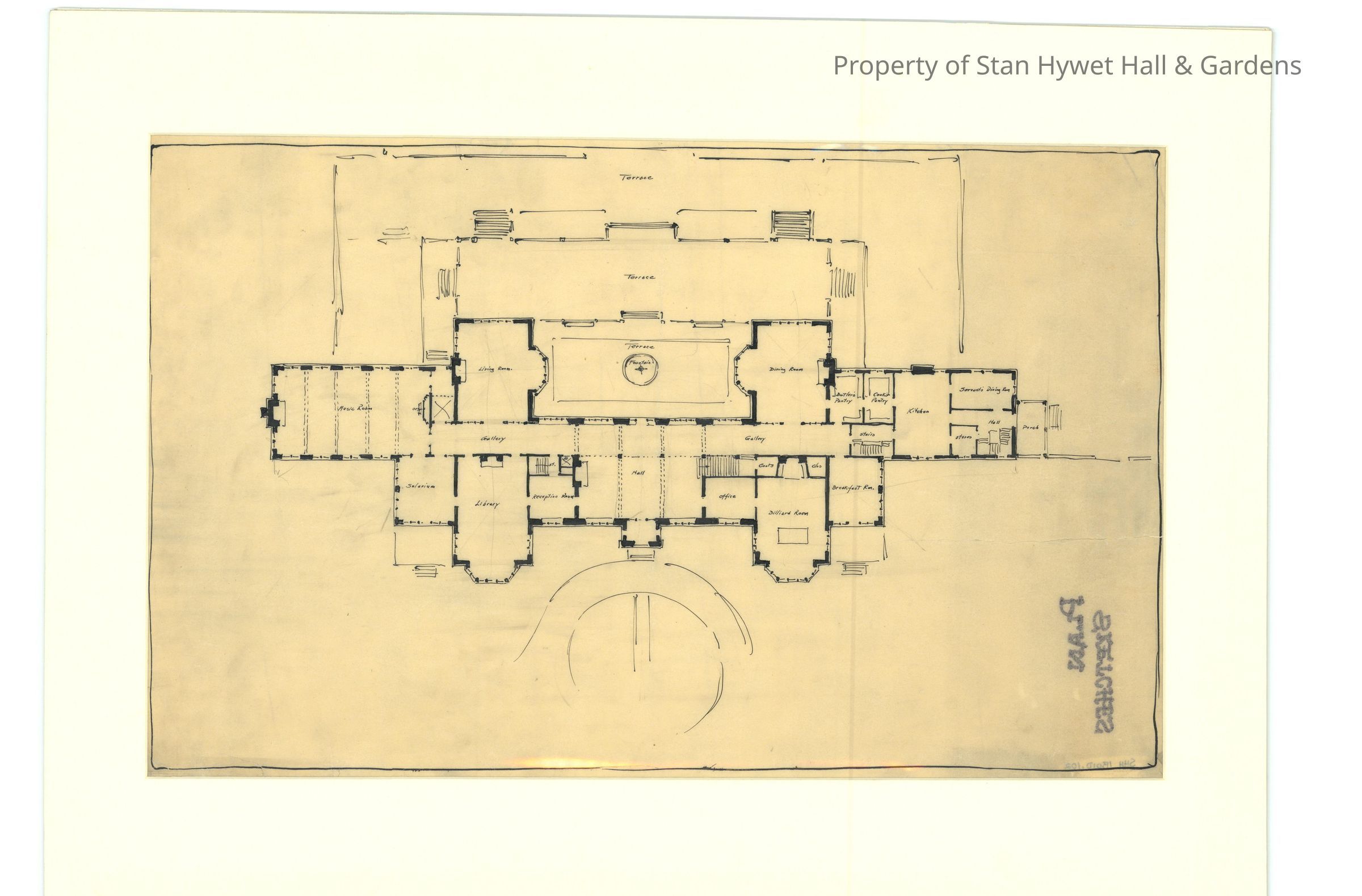 Historic Drawing: Concept floor plan for the first floor of Stan Hywet Hall, including concept of the west terrace and surrounding grounds.Collection