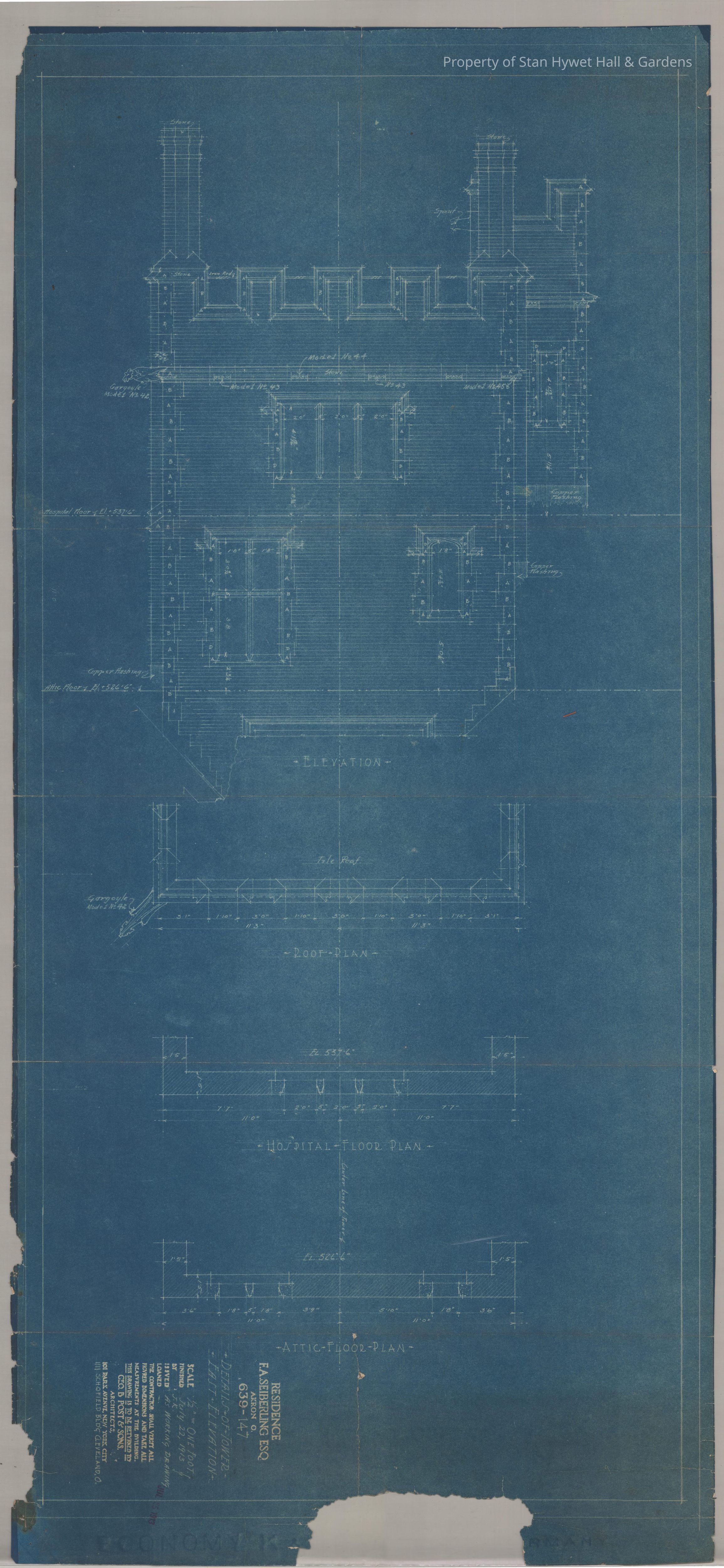 Historic blueprint: Detailed drawing of the Tower's east elevation. Titled "Details of Tower-East Elevation".