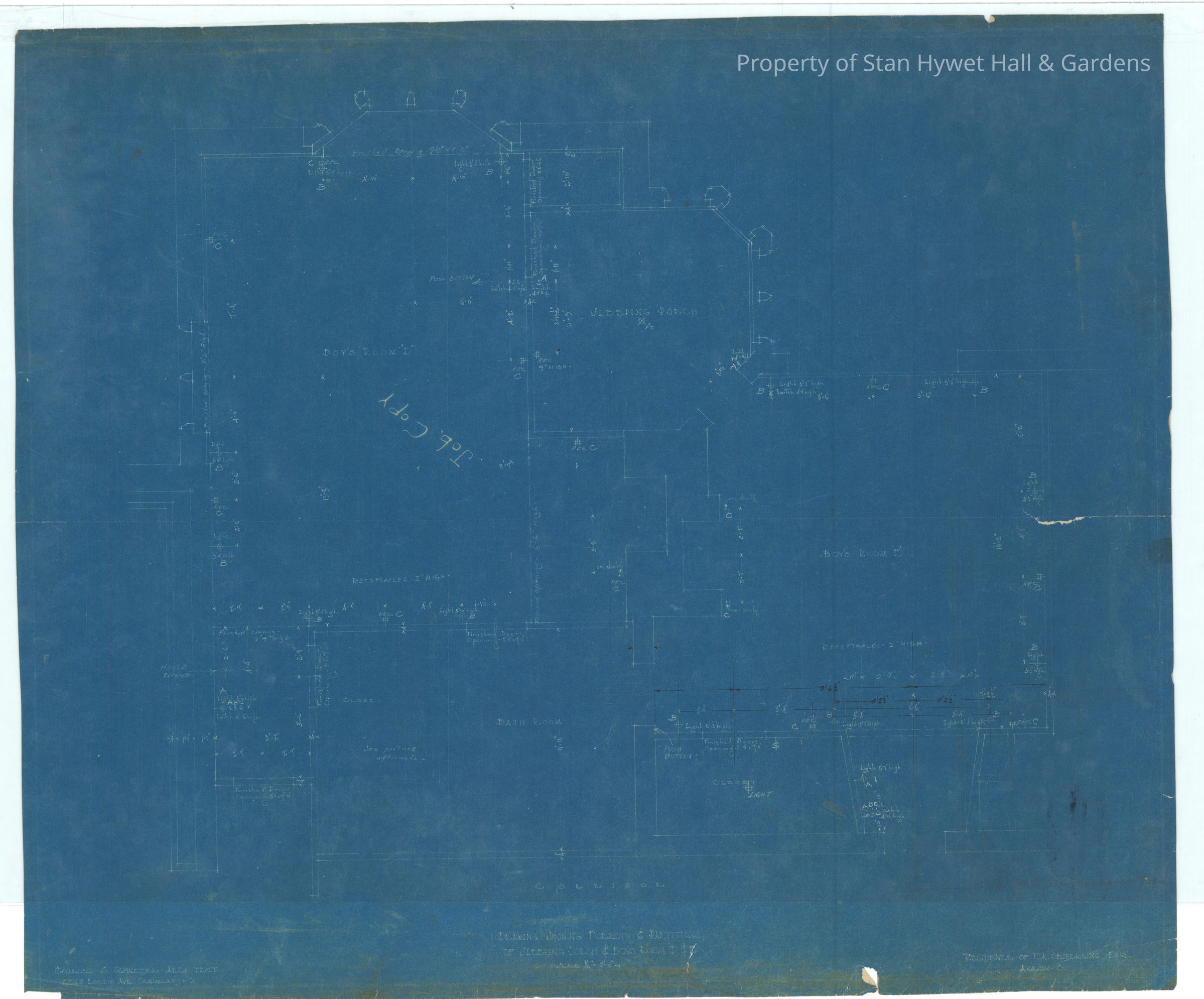 Historic blueprint: Plan for the furring, partitions, and electrical for the Boys' Room and Sleeping Porch in Stan Hywet Hall. Titled "Drawing Showing Furring & Partitions of Sleeping Porch & Boys Room D & E".