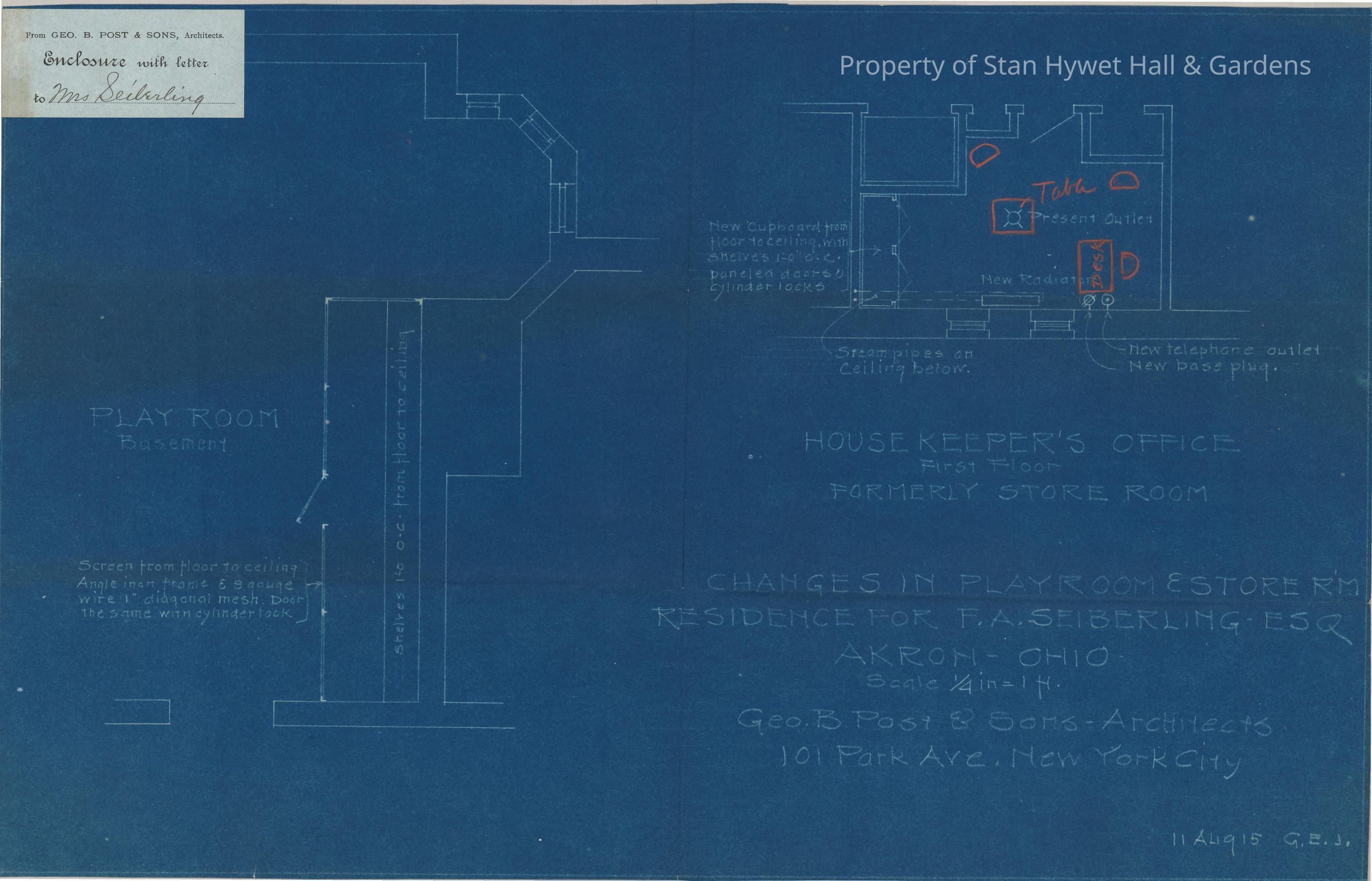 In top left corner is an attached note that says "From GEO. B. POST & SONS, Architects; Enclosure with letter to Mrs. Seiberling".