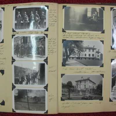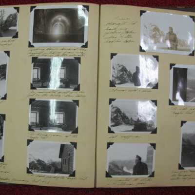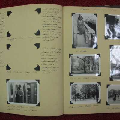 Brown leather bound scrapbook with gold highlights containing numerous photographic prints. Comprising 65 pages with 301 photos (mostly B&W) mounted to both sides of the pages with hand written captions and notations. Title page hand written "John F. Seiberling Jr 1942-45" which includes WWII photos and Hitler's "Eagles Nest" retreat. Also includes a few 1937 photos from Staunton Military Academy, Michigan 1946 & 47, and others. Some of the photos are missing from their slots.Collection