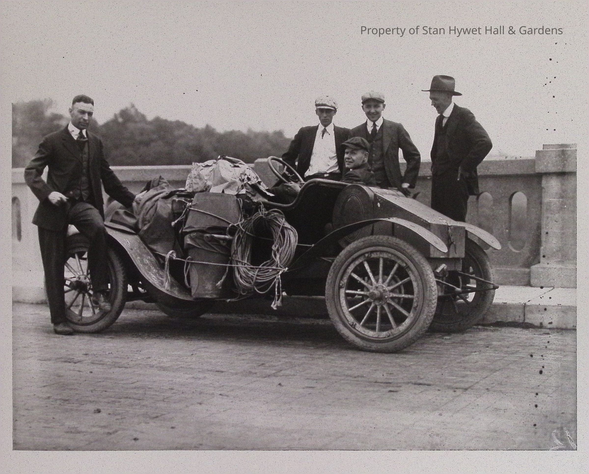 Print developed from gelatin dry plate glass negative. Five unidentified men wearing suits pose with car loaded with supplies for parachute drops on bridge. One man sits on front fender of car; another sits behind steering wheel of car; three stand on sidewalk of bridge behind car. Rope, tarps, and unidentified object tied to car. Series of parachute drops.Collection