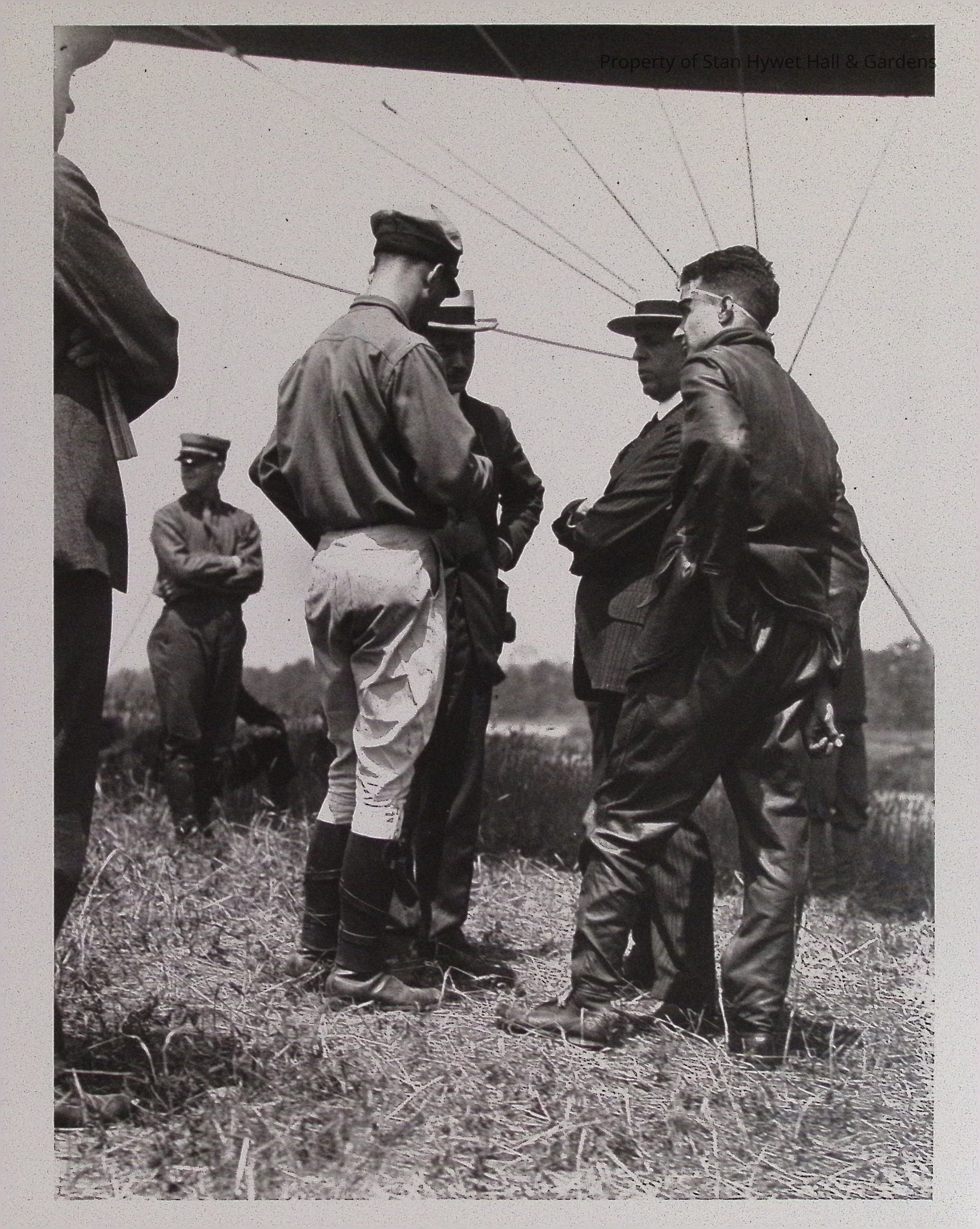 Print developed from gelatin dry plate glass negative. Seven unidentified men with Ralph Upson in a field; dirigible suspended above men; ropes extend upward to dirigible; four men stand together in center; man stands with back towards camera wearing light colored hat with bill, dark long sleeved shirt with light pants and shin covers; tow men facing camera, one wears dark business suit, light colored hat with dark band, one wears dark business suit with dark stripes, light colored hat with dark band; Ralph Upson with left side to camera wears goggles on forehead, leather pants and jacket pilot clothing; portion of man in dark suit and hat visible in foreground; foreground is covered with grass; two men in left background, one wears billed hat, dark shirt with tie tucked in, dark pants and boots, partially visible man sits behind him wearing dark clothing; in right background partially visible man stands wearing dark clothing; taller grass and trees line background. Series of "Flight for Board" prints.Photograph Details