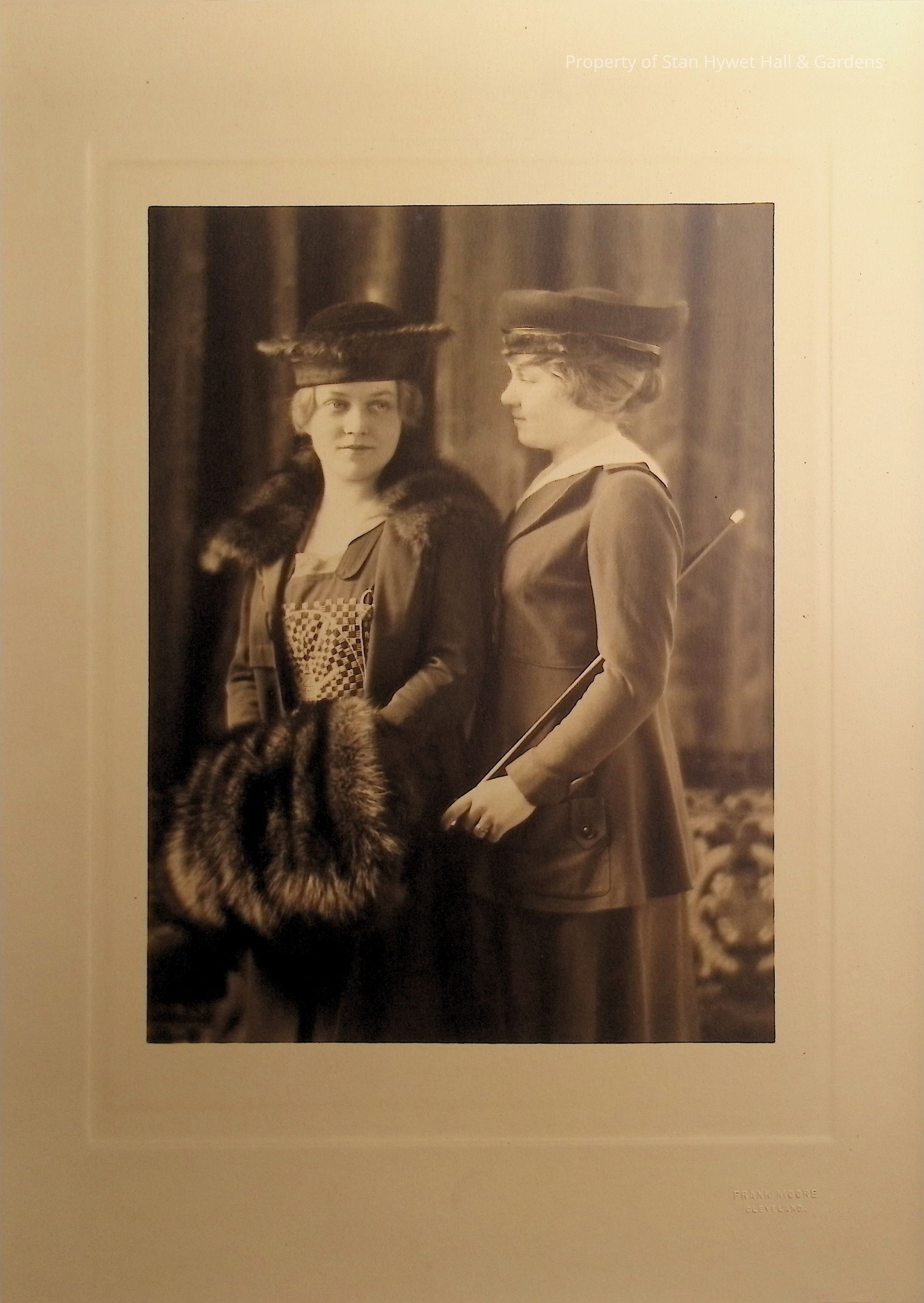 Black and white photograph on mounting board. Portrait of Irene and Virginia. Irene standing on left with a silver fox-fur muff; Virginia on right with a cane under her arm.Photograph Details