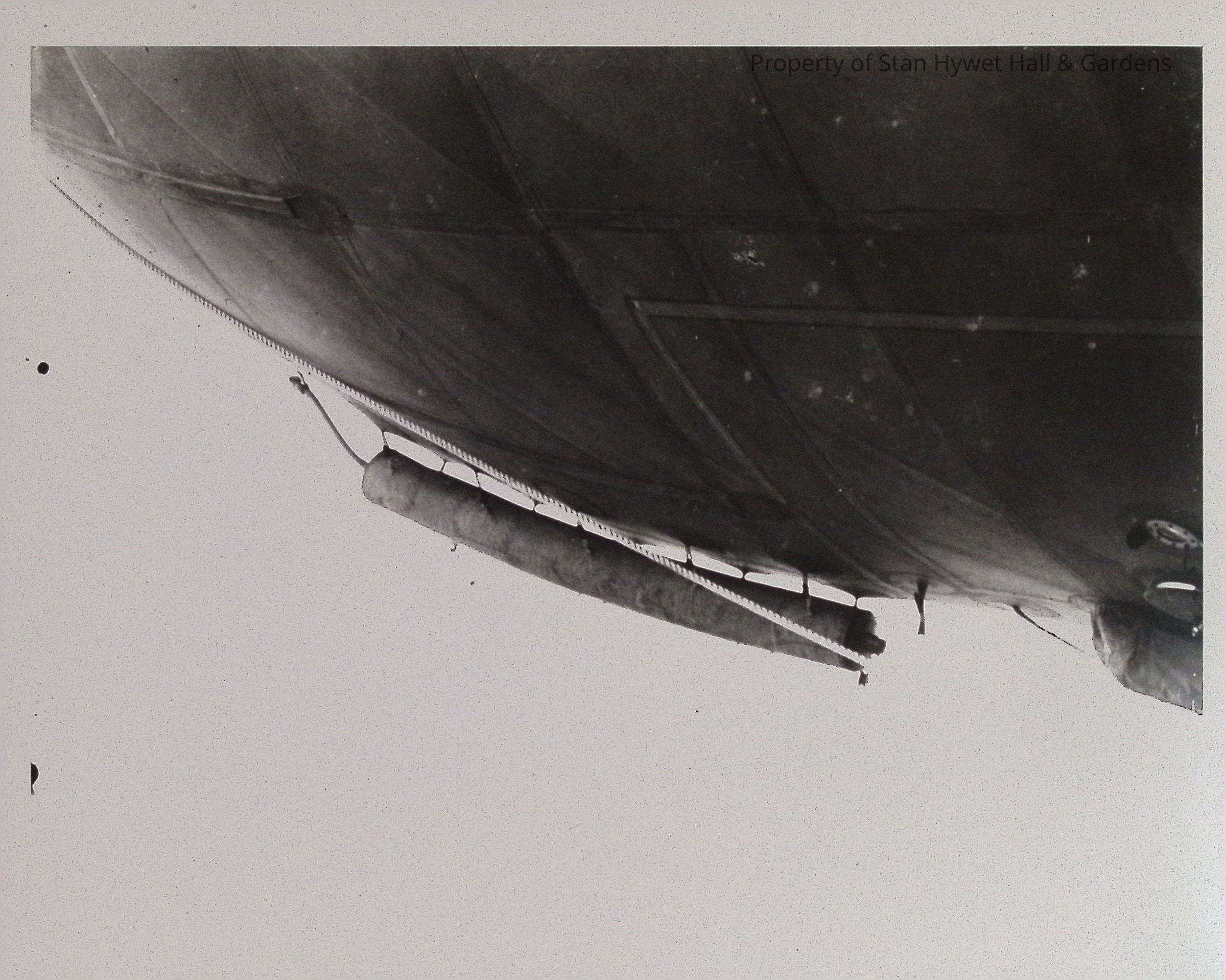 Print developed from gelatin dry plate glass negative. Underside of dirigible. showing seams in dirigible skin. Rope runs along dirigible. Dark colored tubular object hangs from the bottom of the dirigible.Photograph Details